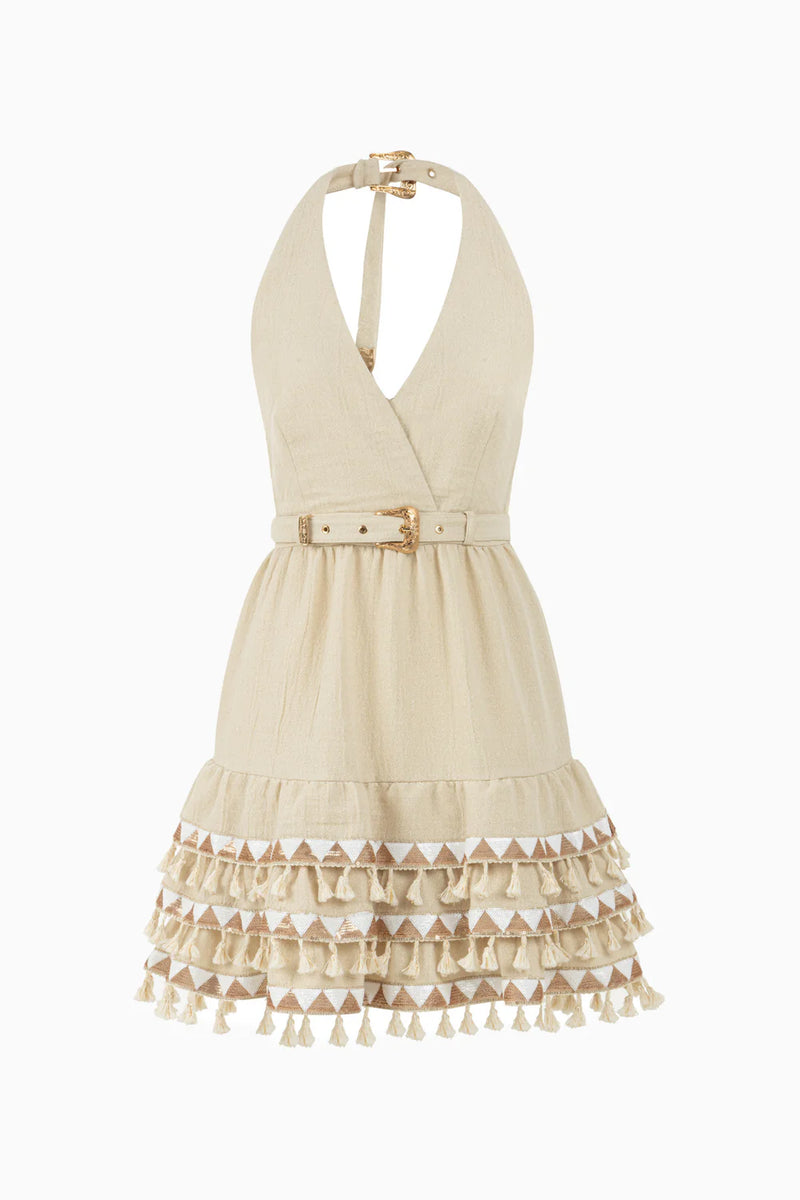 The Riya dress is crafted from airy fabric with intricate embroidery along the hem, tassels, and an adjustable belt featuring gold detailing. This piece offers a delicate elegance that feels timeless, capturing the beauty of heritage with a modern twist. Riya balances intricate detailing with a gentle silhouette, evoking a sense of quiet sophistication and a playful spirit.