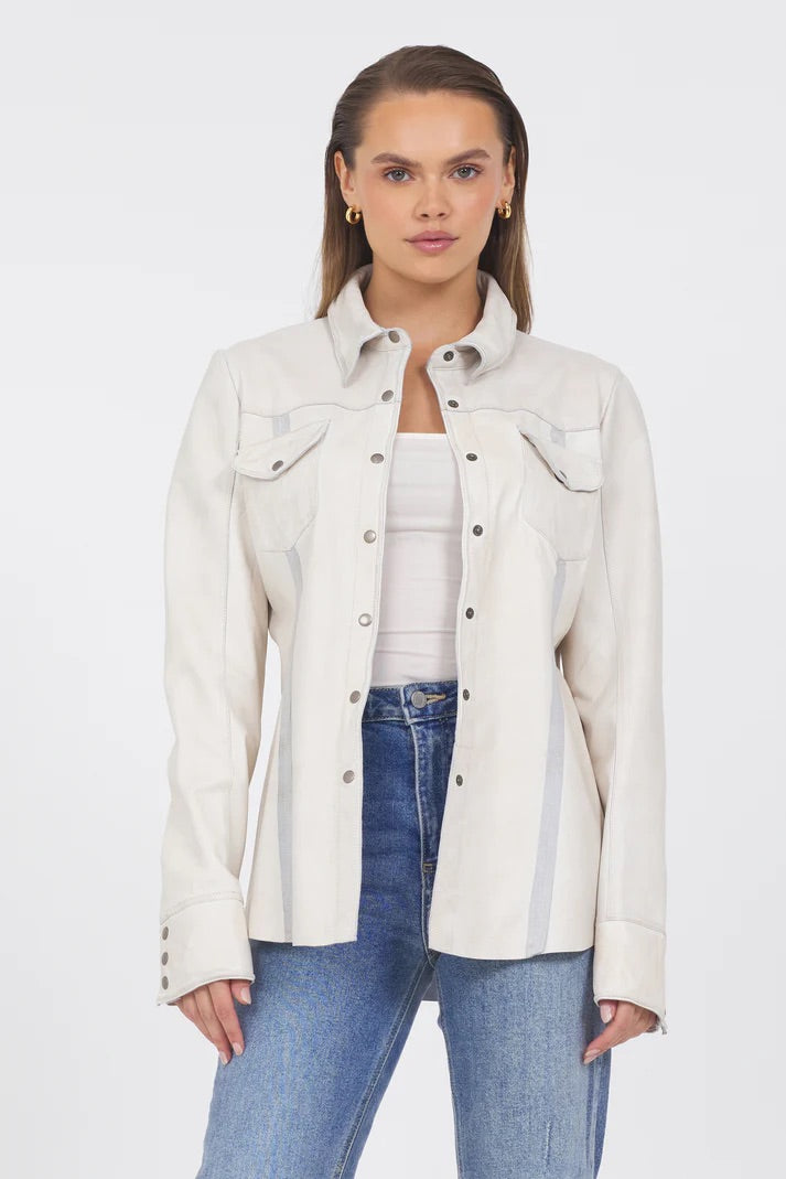 A true chameleon. A Western-inspired, shirt-style leather jacket featuring a snap front and two front pockets with snap closures. The perfect transitional piece, throw on your favorite pair of straight leg jeans and call it a day.