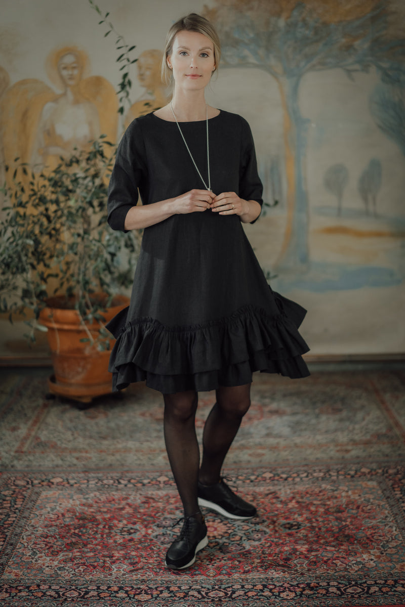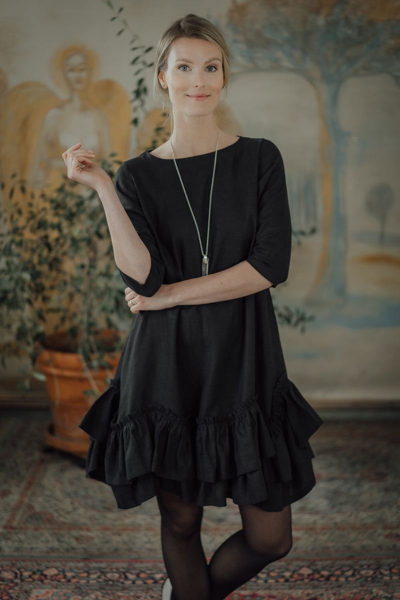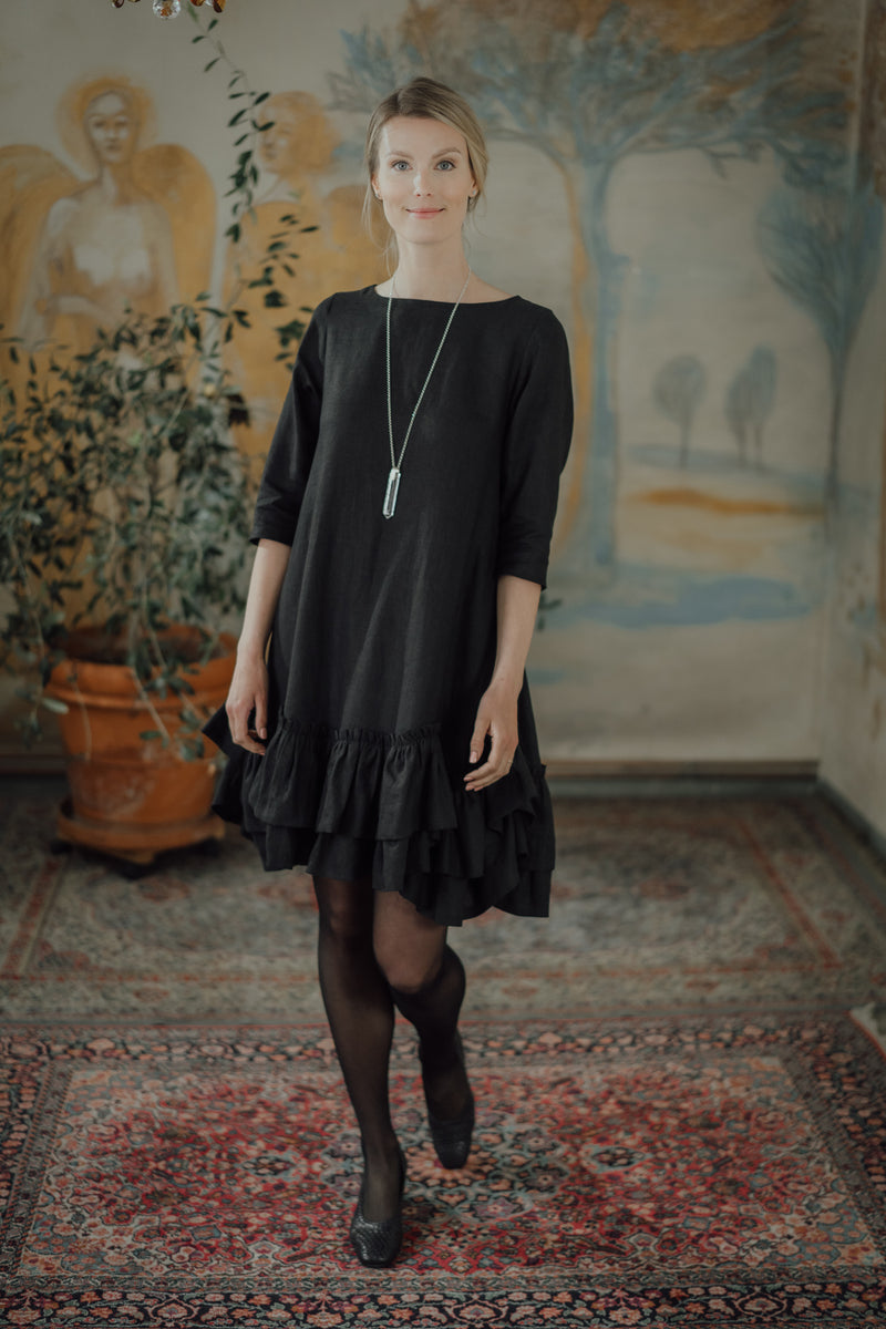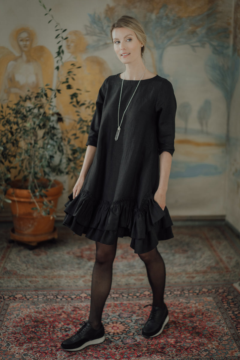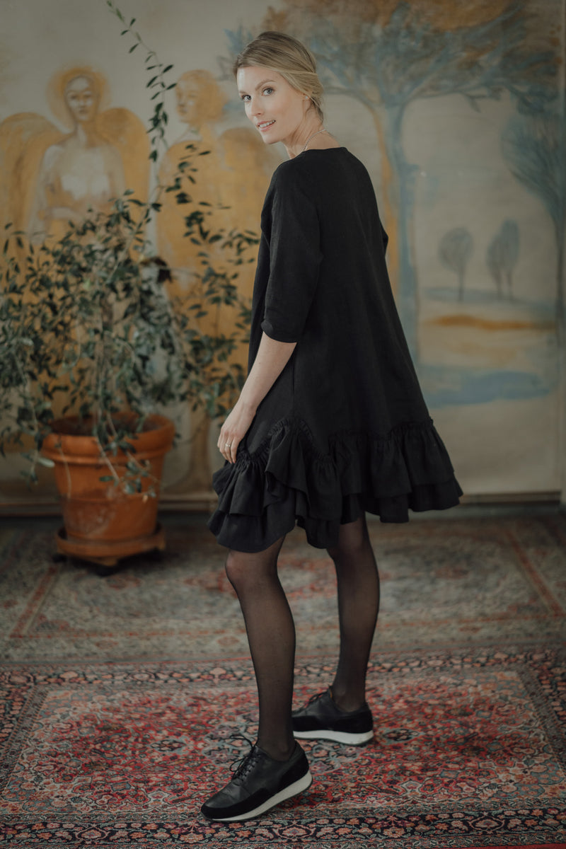 The Rose Dress is a romantic and chic, A-shaped dress made from soft, OEKO-TEX® certified black linen. Versatile for both resort and city wear, it offers a relaxed fit that becomes playful with movement. Comfortable year-round, this dress gently hugs the skin, combining style and ease.