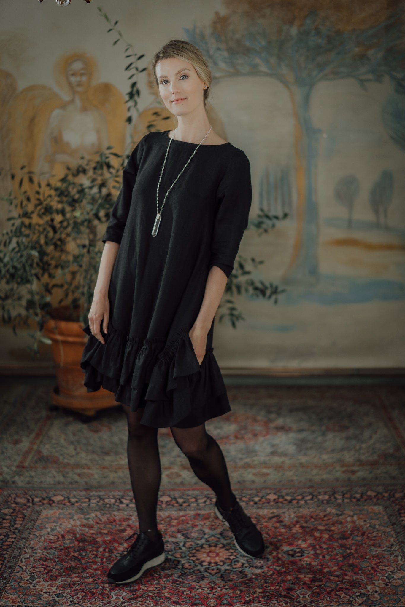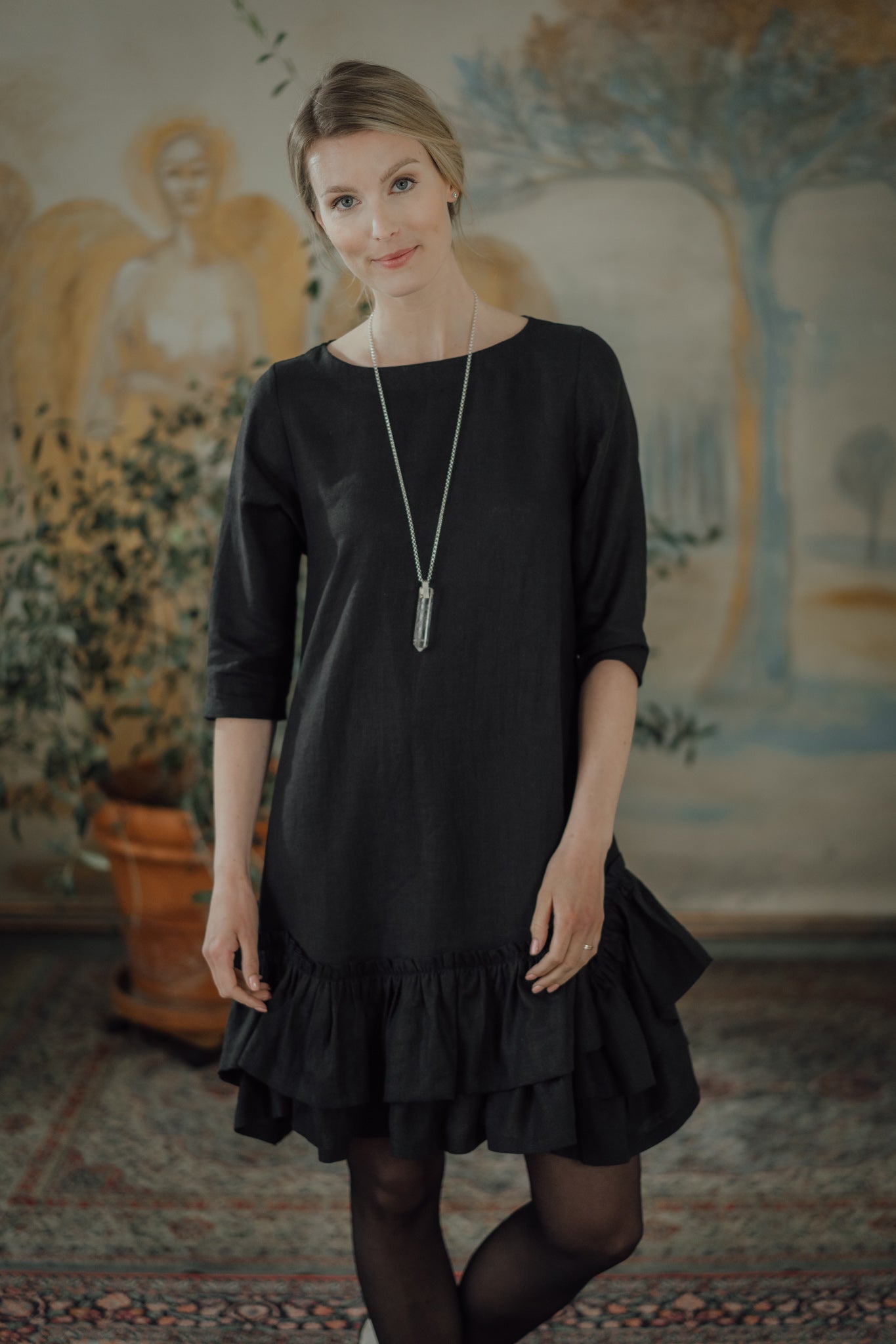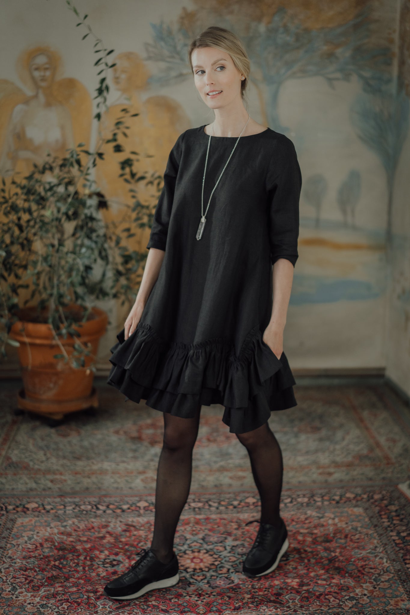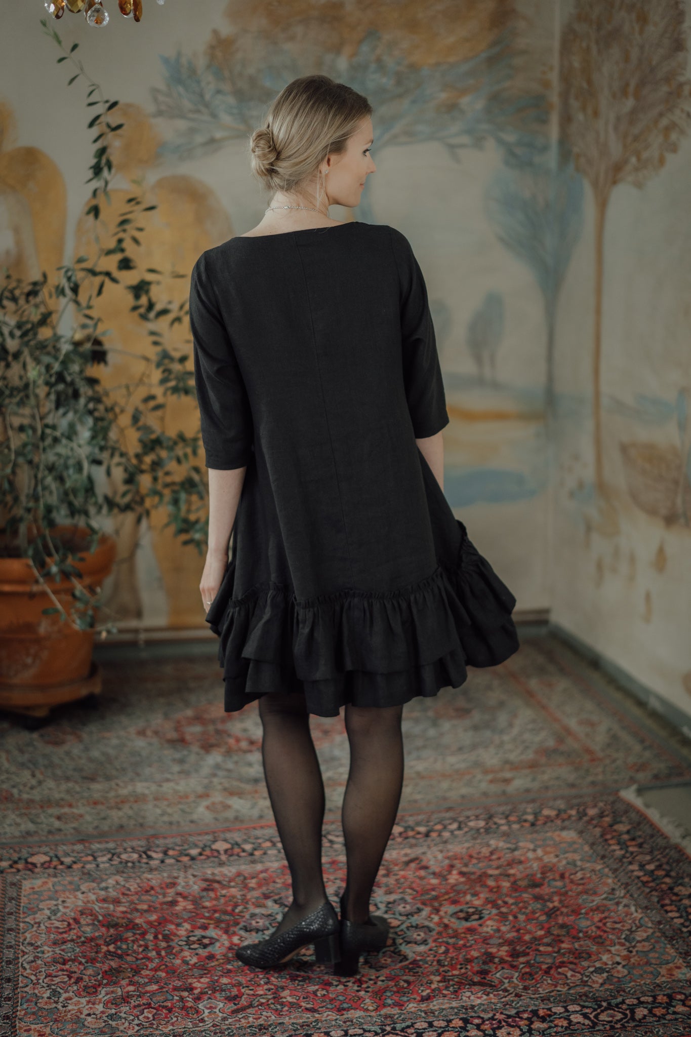The Rose Dress is a romantic and chic, A-shaped dress made from soft, OEKO-TEX® certified black linen. Versatile for both resort and city wear, it offers a relaxed fit that becomes playful with movement. Comfortable year-round, this dress gently hugs the skin, combining style and ease.