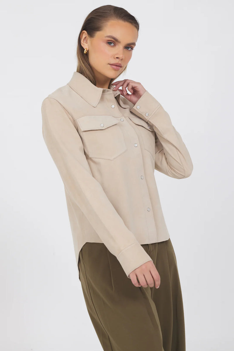 Snap it up. A long-line, slim fit vintage look with deconstructed fringe seam detailing marries rough and ready style with soft sophistication. Pair with your favorite lived-in jeans and a tank and be ready to be seen.