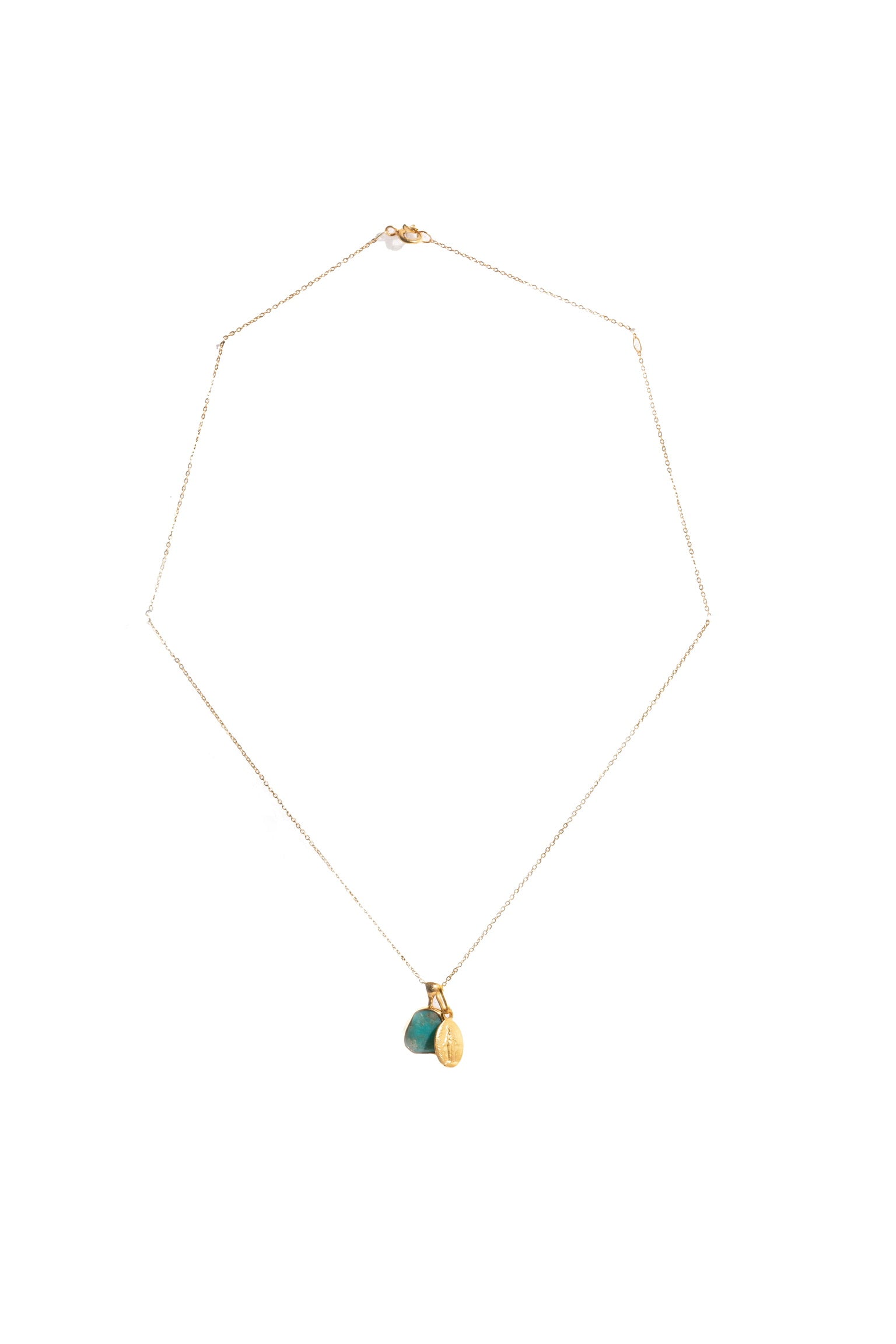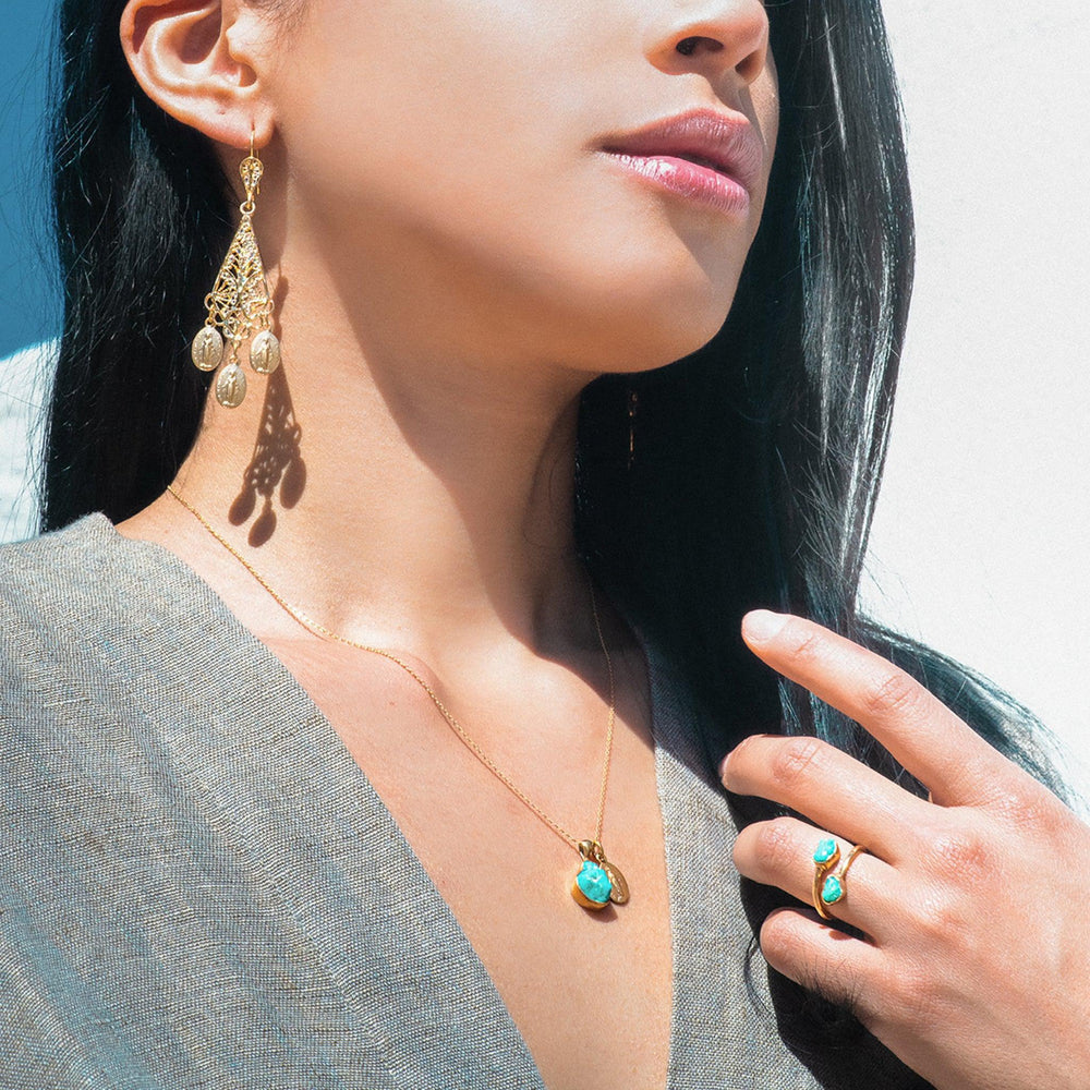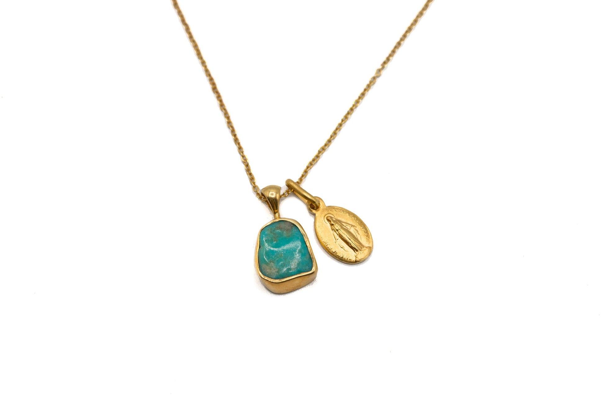 Good Tidings Style's Dream Pendant Necklace has a chain of 22k vermeil gold over Sterling Silver combined with a precious raw Kingman Turquoise pendant embedded in the gold base as well as a medallion depicting the image of the Blessed Virgin in the front and the letter M in the back surmounted by a small cross and below the sacred heart of Jesus with the Immaculate Heart of Mary.