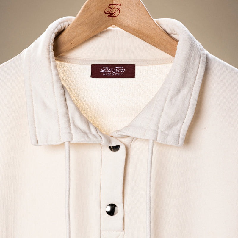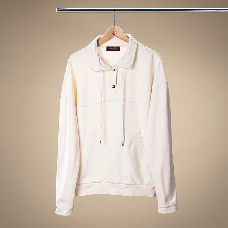 Inspired by the ruggedly handsome yachtsman aesthetic, the Sailor Sweatshirt is a nod to vintage functional design. Featuring snap cuffs for an easy roll and a snap placket for breathability, the garment is intended to secure easily with enough give to tear away quickly in any sporting situation. The collar strings offer additional functionality for protection against the elements - there are too many ropes, cleats, and hardware on a yacht to risk a hood getting caught.