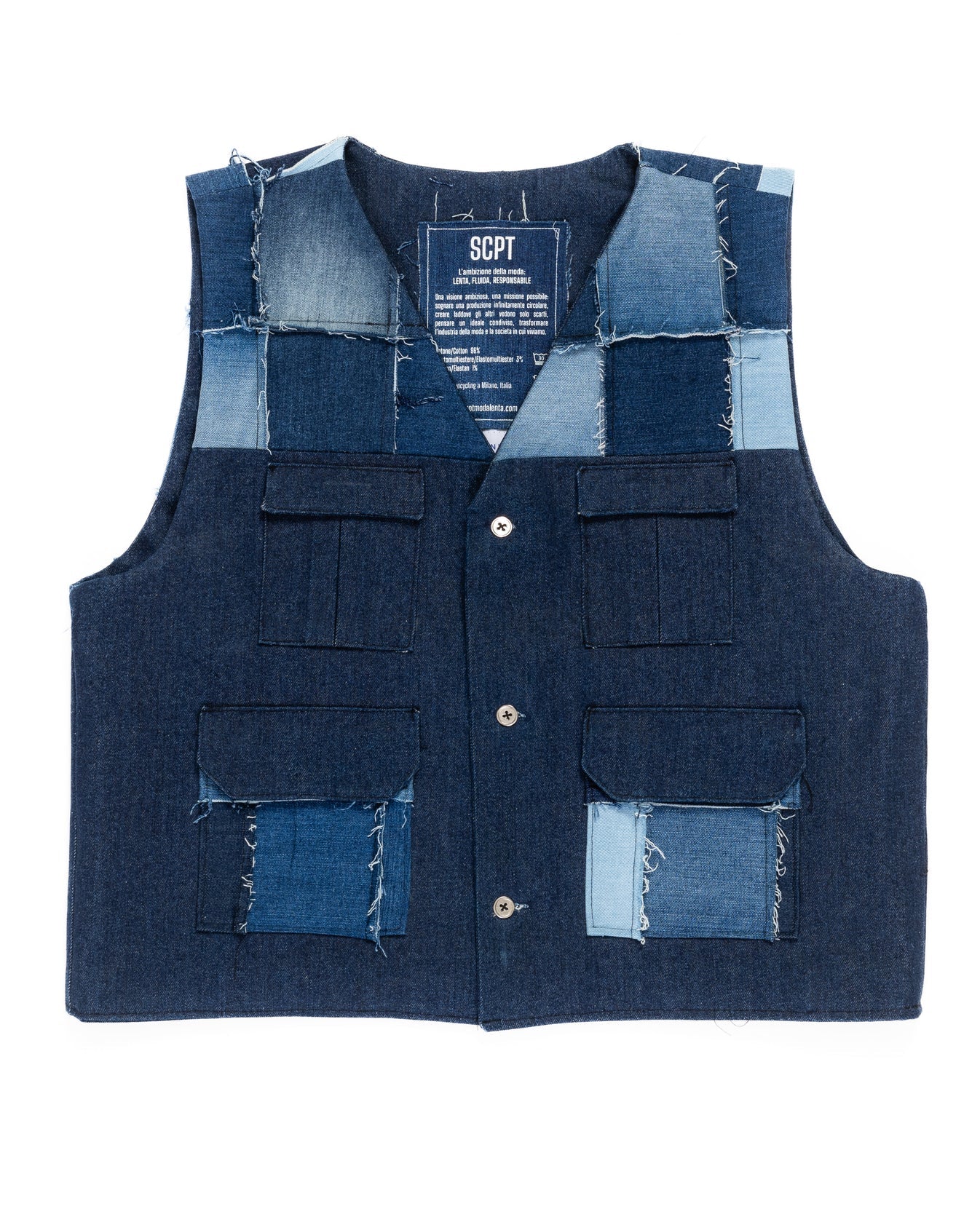 Work gilet in one wash denim with linen and patchwork inserts at top, front button closure, four front pockets, large back pocket and side pen pocket.