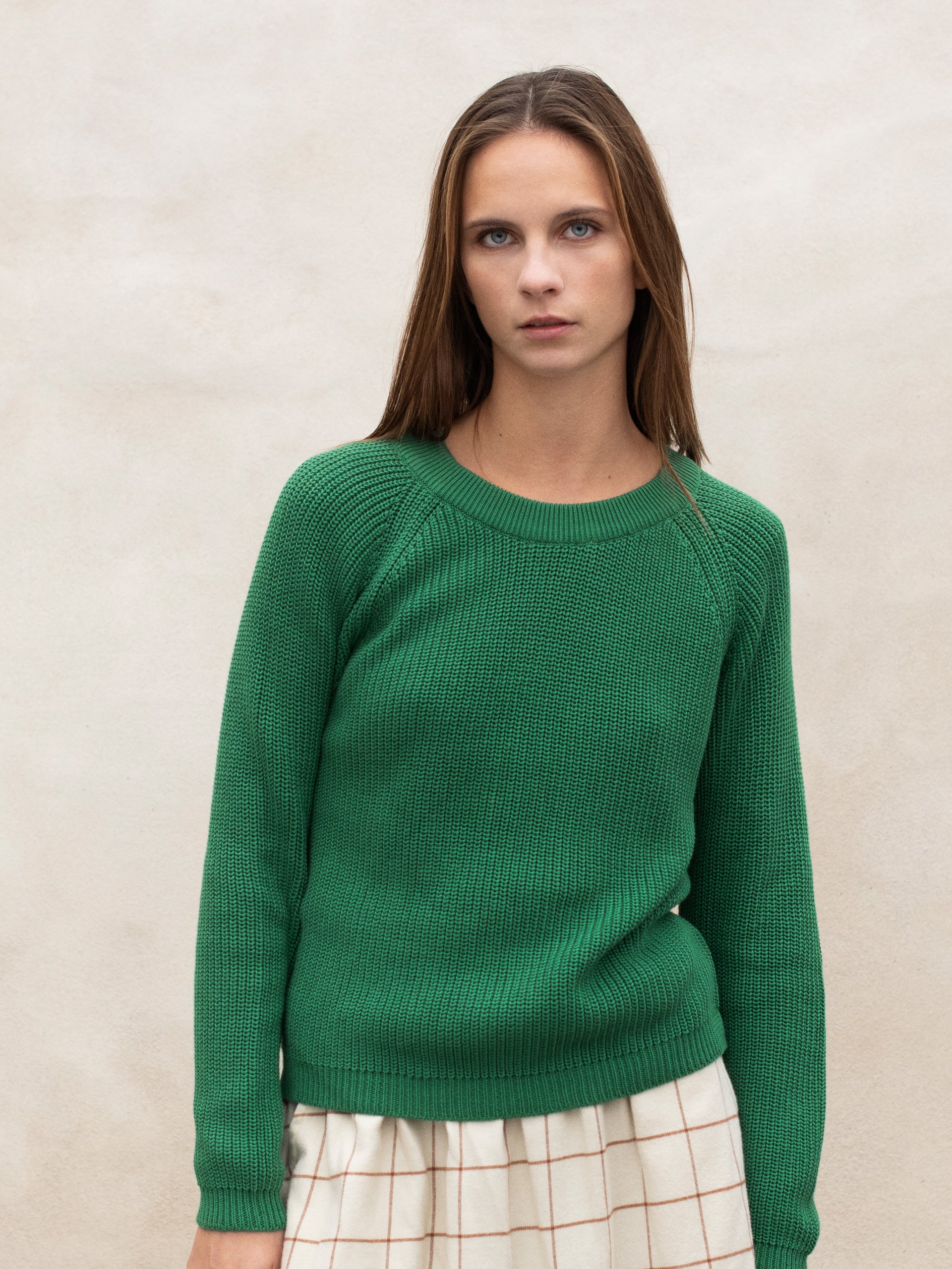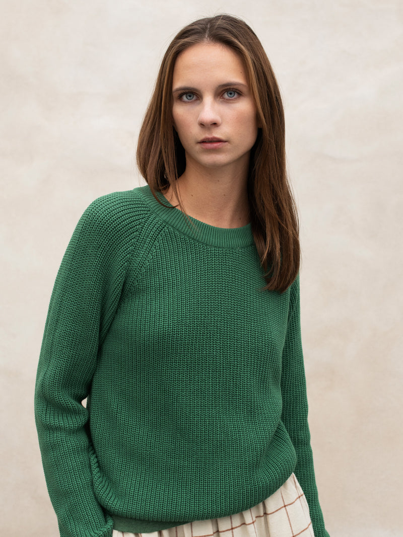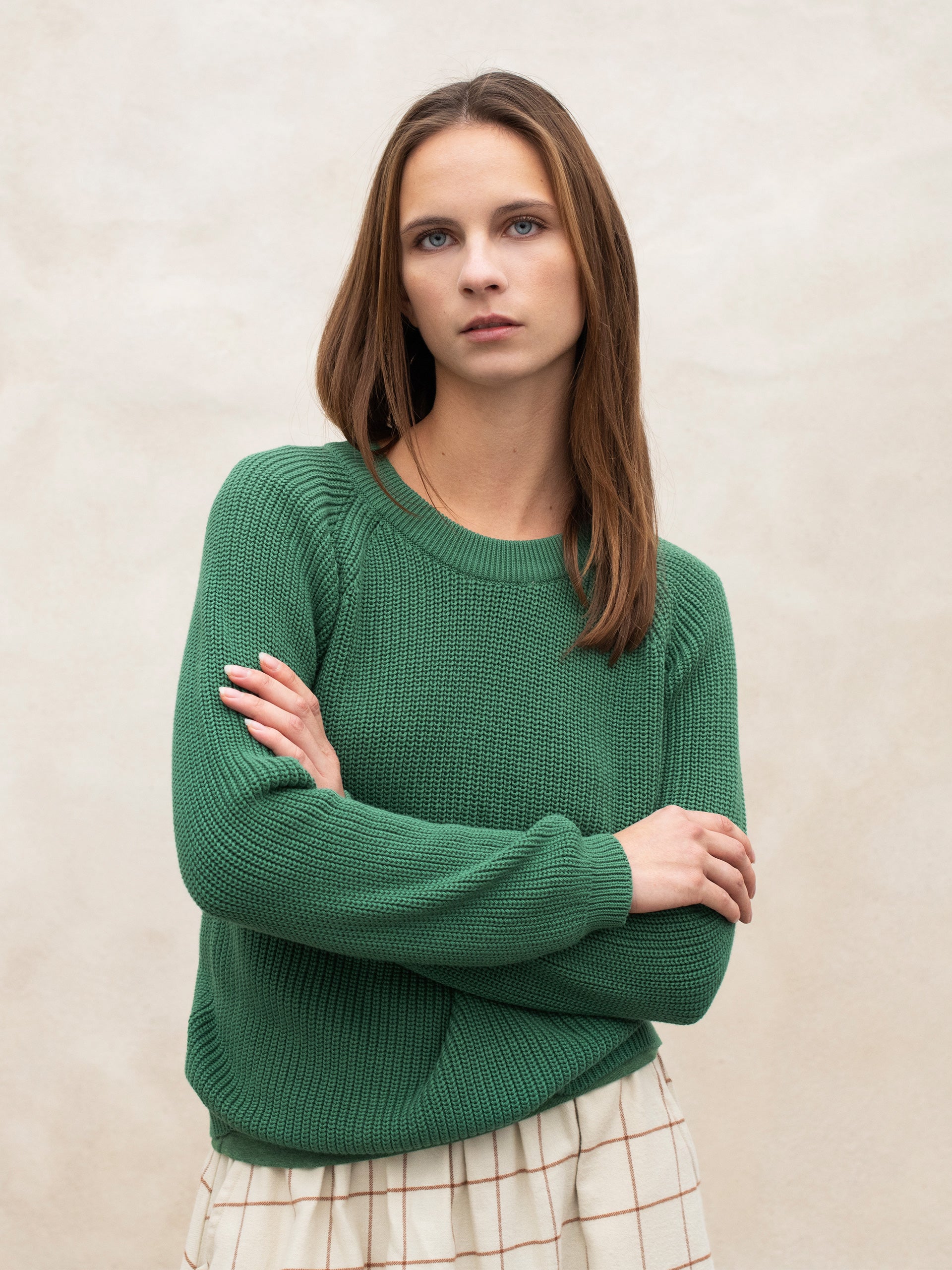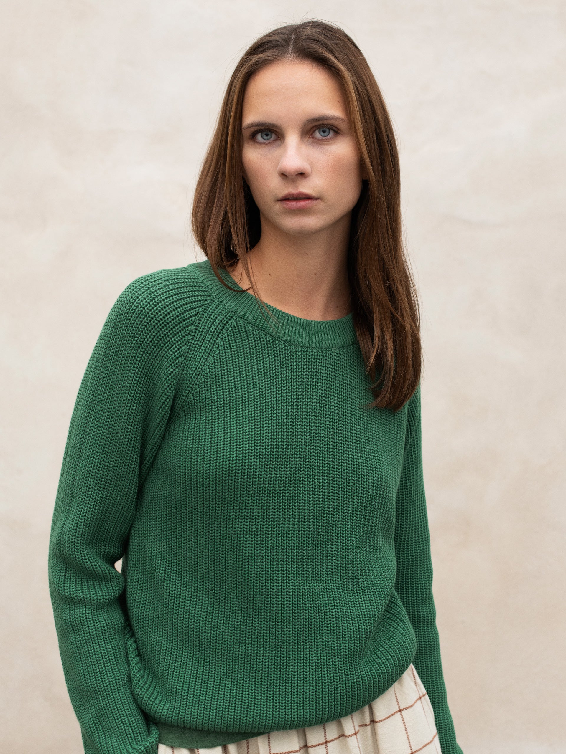 Brioche knitted organic cotton sweater in a deep green colour. Design with raglan sleeves and rounded neckline. 100% organic cotton. Soft and easy to wear. GOTS certified.