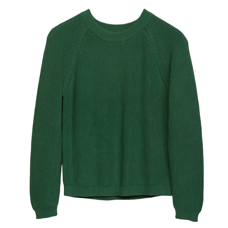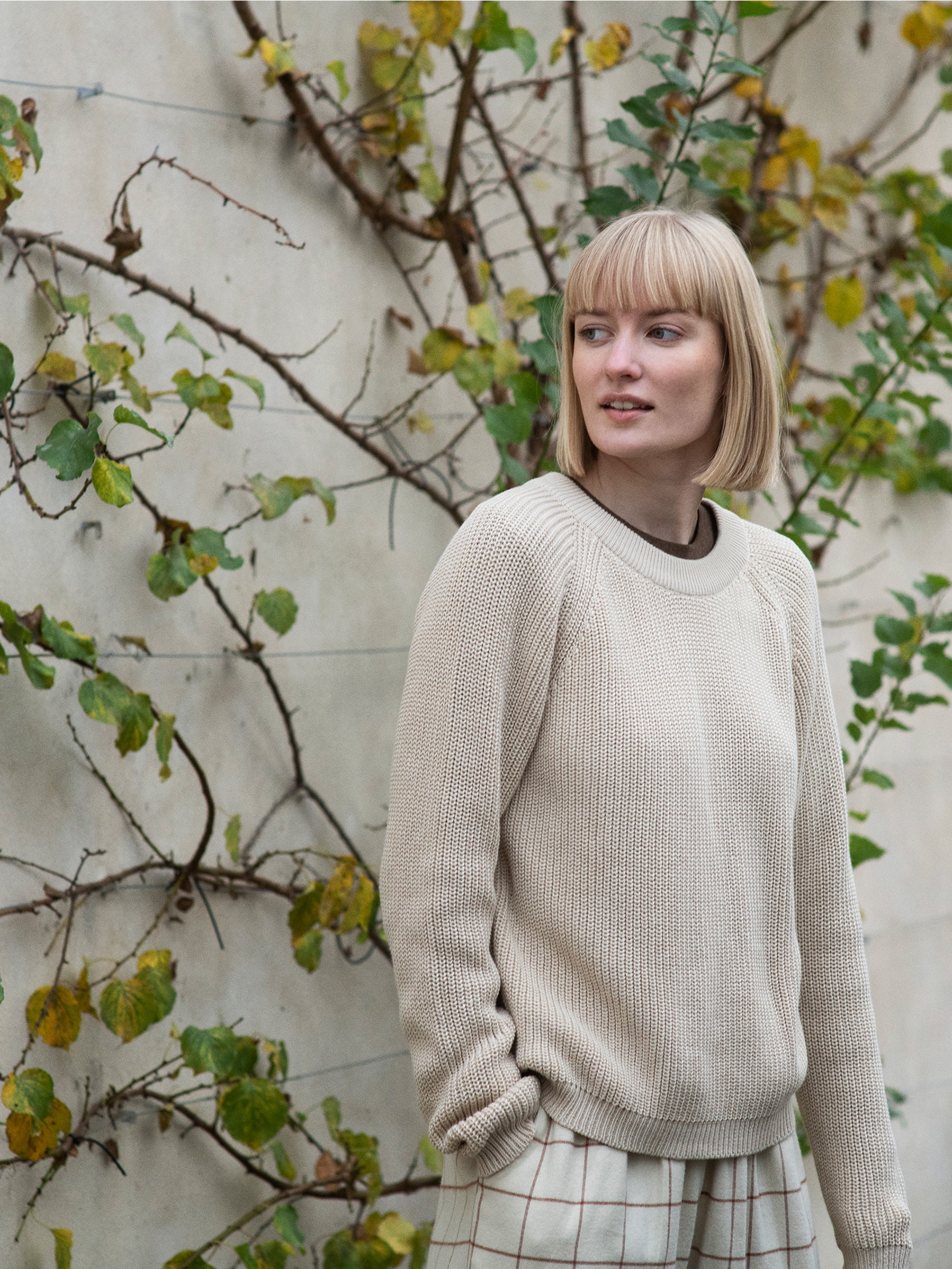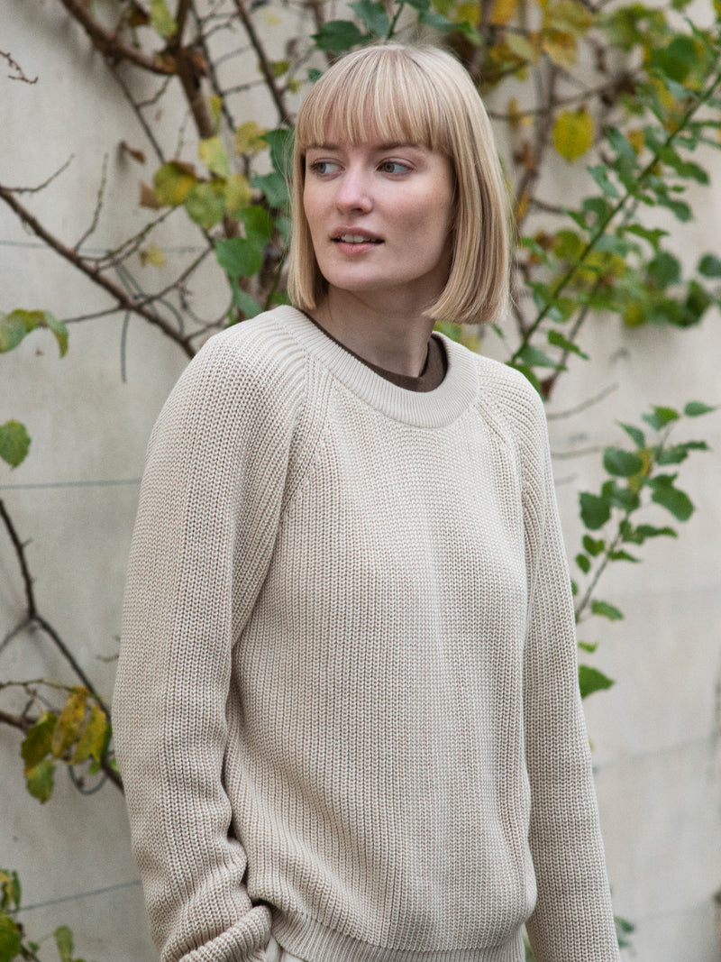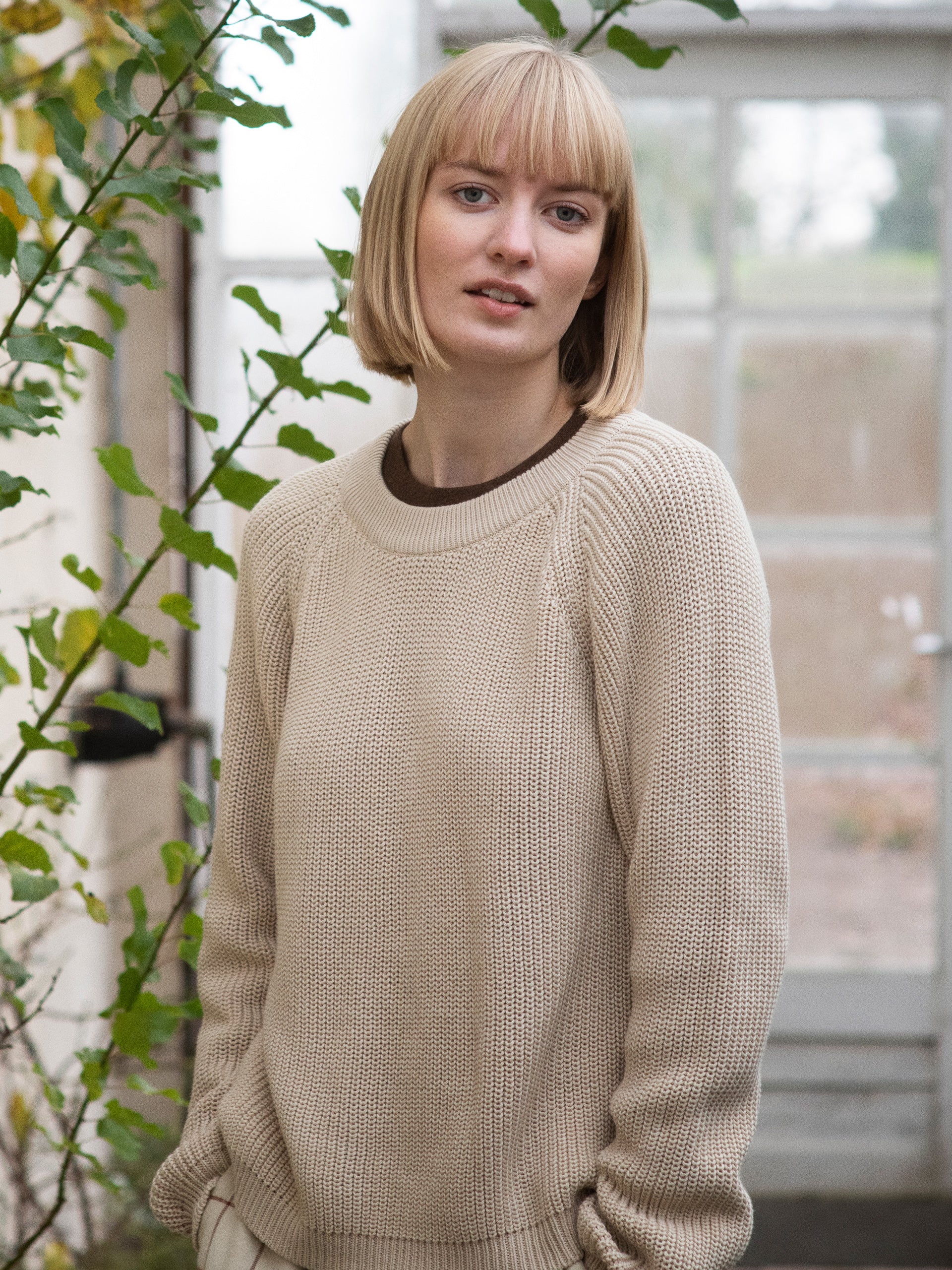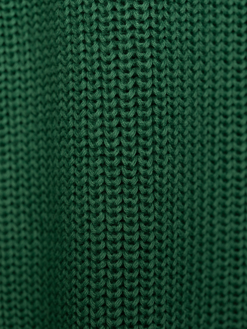 Brioche knitted organic cotton sweater in a deep green colour. Design with raglan sleeves and rounded neckline. 100% organic cotton. Soft and easy to wear. GOTS certified.