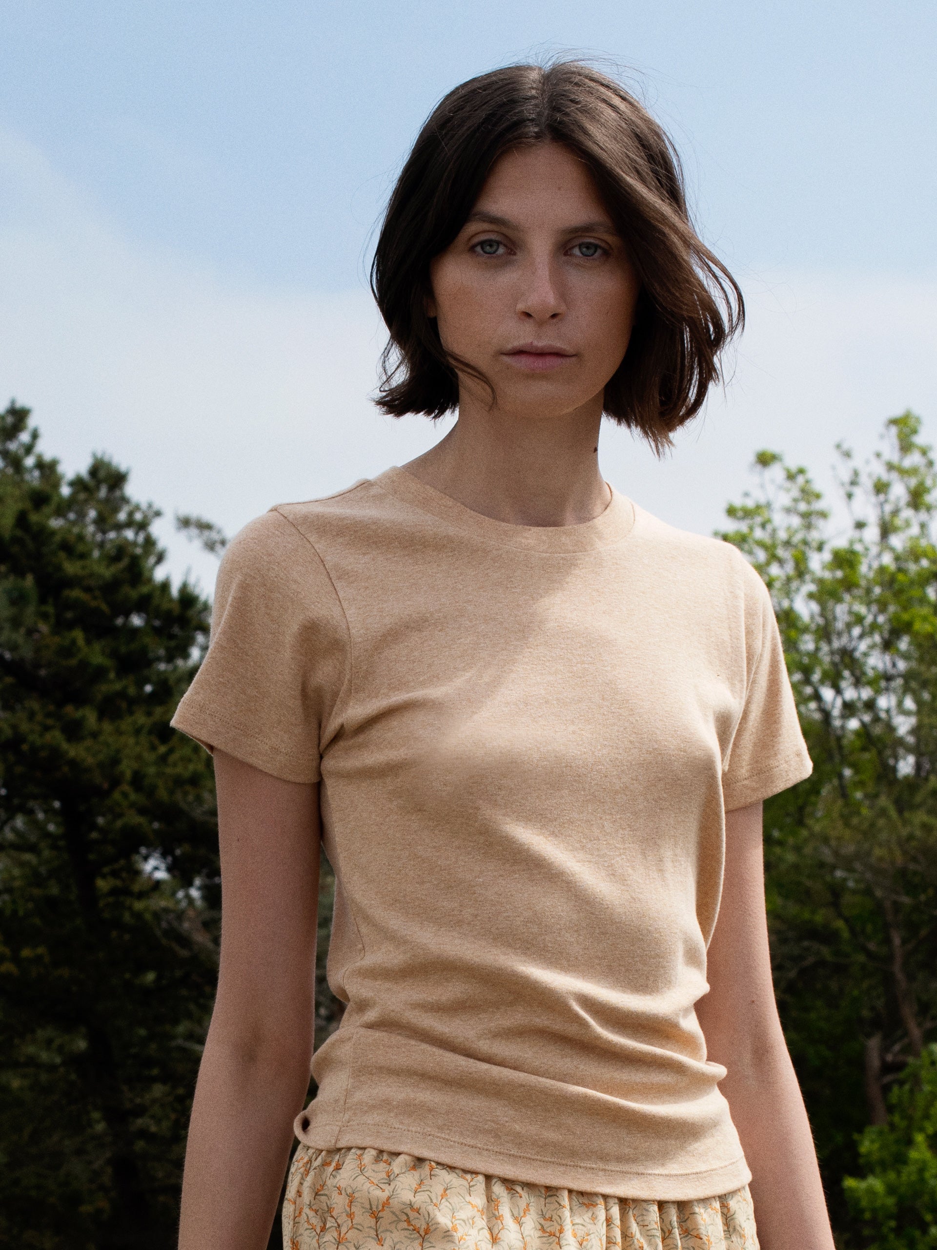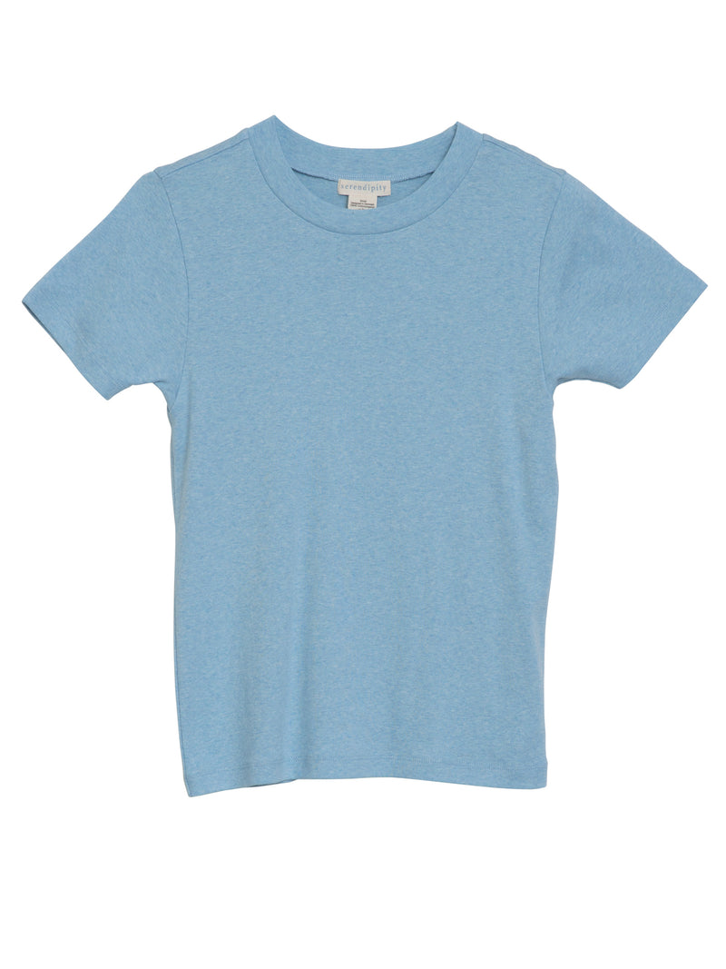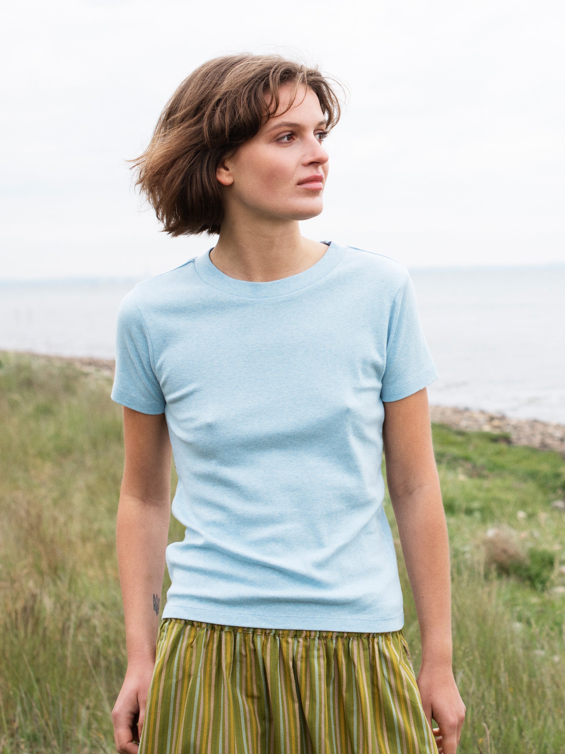 Soft short sleeved tee with a round neckline. The fabric is made from 100% pure organic cotton in Aqua blue melange. The fit is relaxed and classic - Making the style a wardrobe favourite. GOTS certified production.