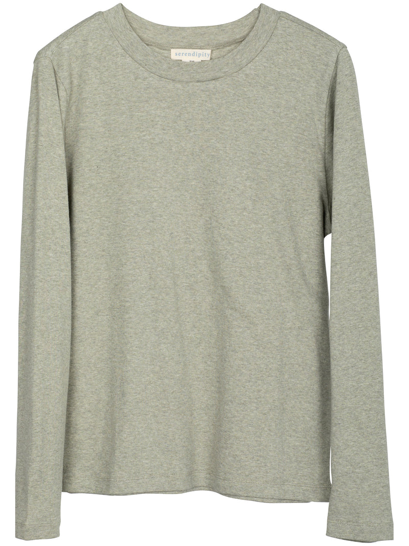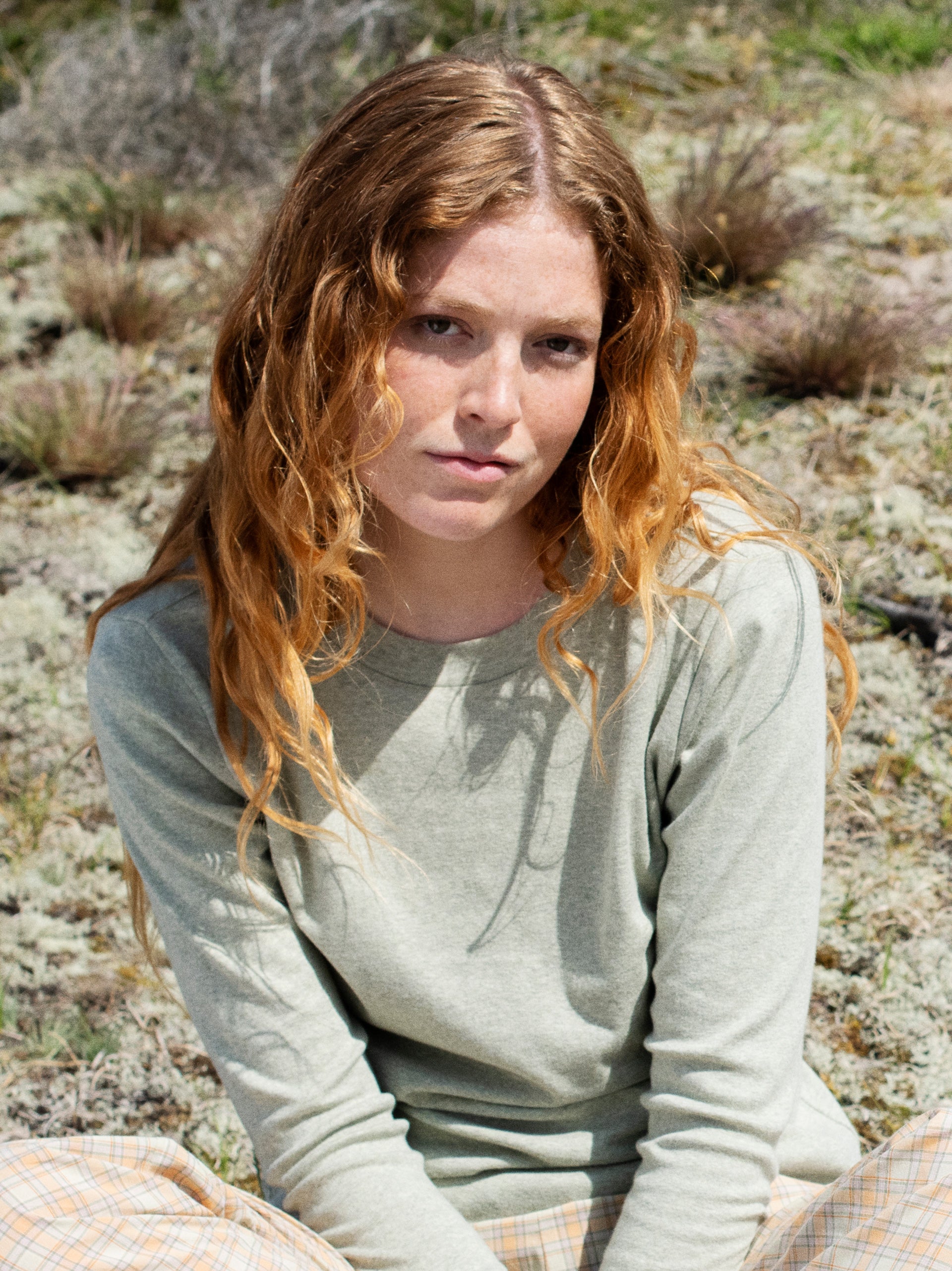Soft loose fitted t-shirt with long sleeves and round neckline. Mélange rib in the finest organic cotton quality in soft shades of green. GOTS certified softness and comfort for the everyday wardrobe.
