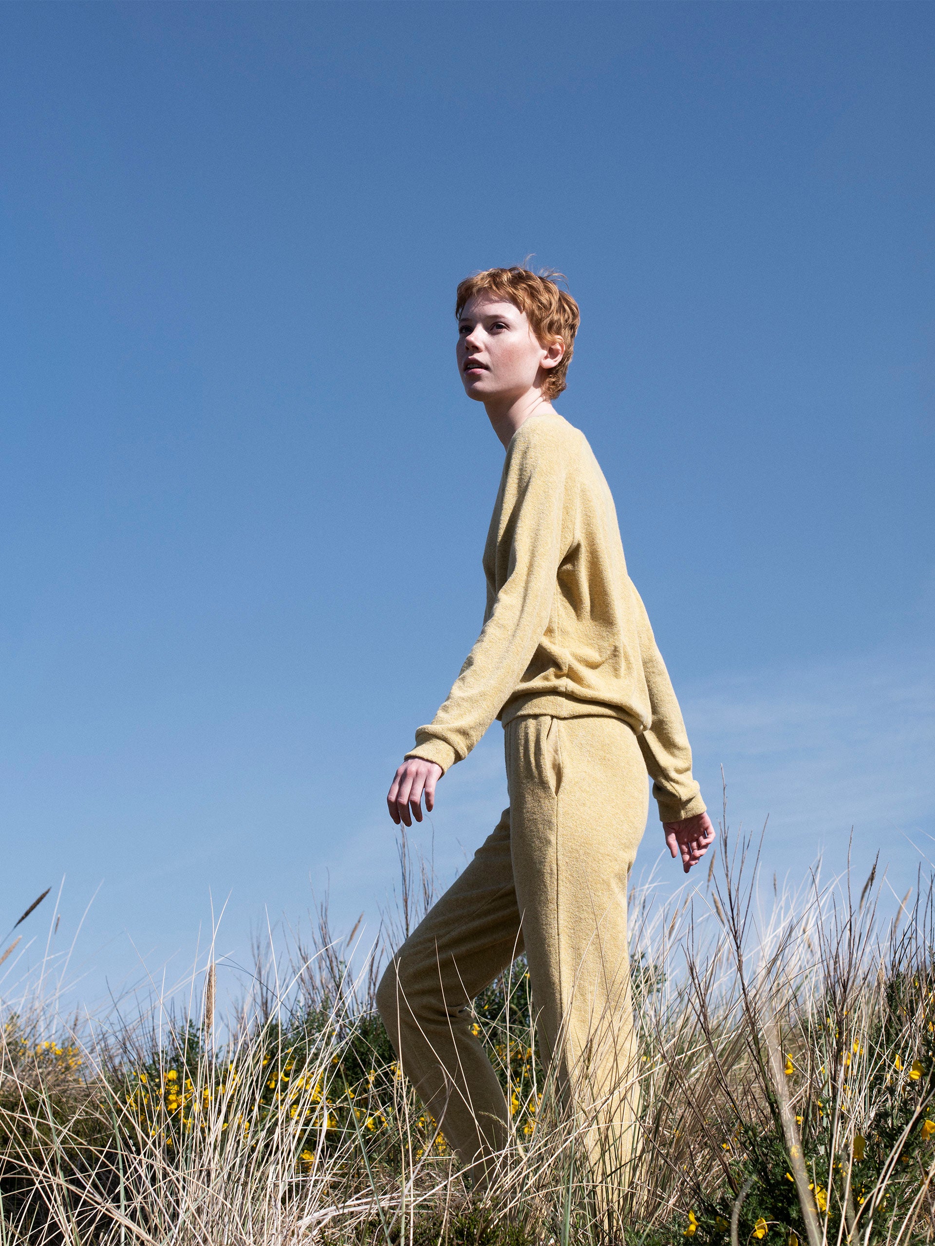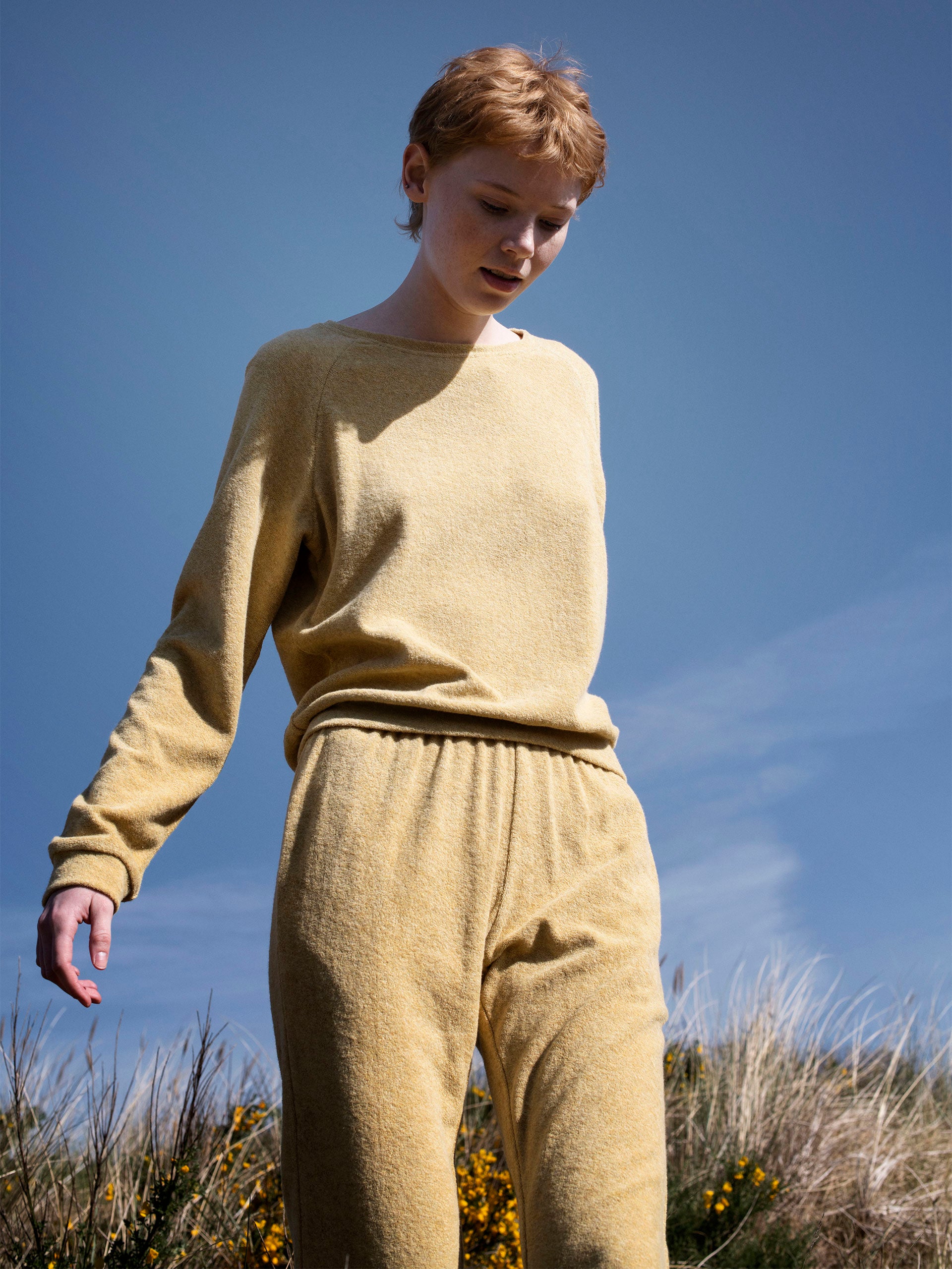 Terry blouse in lovely straw yellow melange colour. Raglan sleeves and rounded neckline. The terry fabric is knitted with loops, making it heavier and warmer than rib but from the same super soft melange yarn. 100% organic cotton and full GOTS certification.