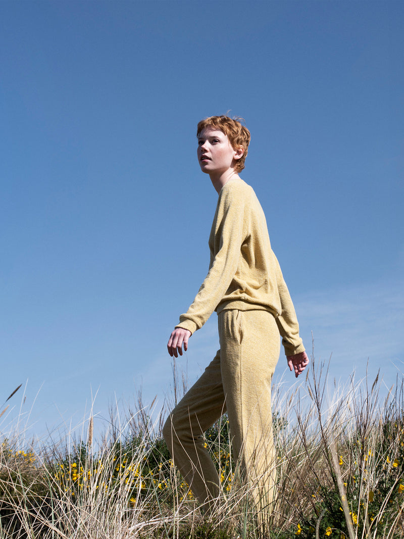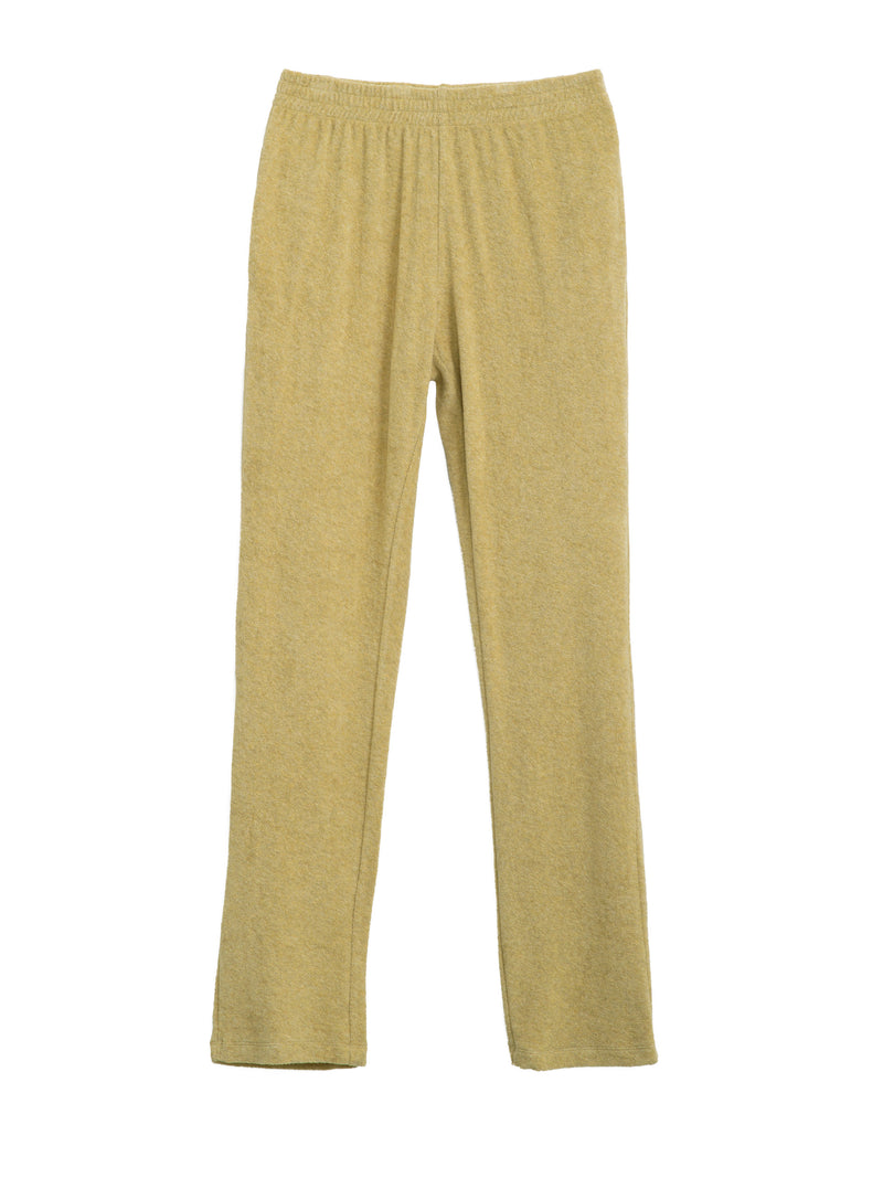 Cotton terry pants in soft melange yarns of 100% organic cotton. Lovely straw yellow melange colour. Hidden side pockets in rib fabric and elastic in the waist. Straight legs. Comfortable for easy wear in the summer. Full GOTS certification.