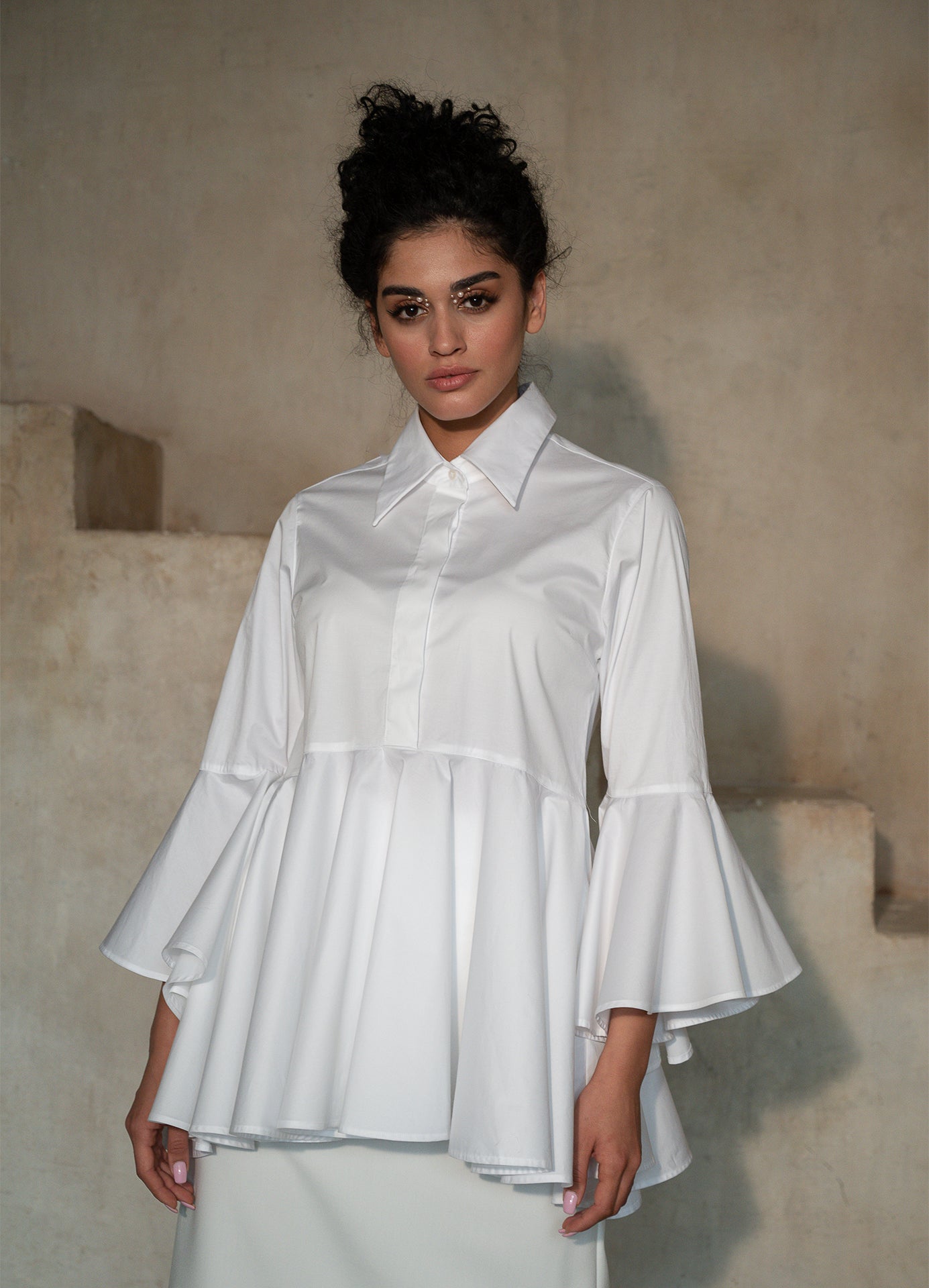 The Sesta shirt represents a harmonious fusion of airy details and straightforward classic elements, featuring timeless attributes such as a classic collar and a pristine white hue. Sesta captivates with its trumpet sleeves and flounced hem, infusing every gesture with a mesmerizing movement that becomes a signature of your personal style. It pairs perfectly with classic pants or a short skirt, showcasing its boundless versatility.