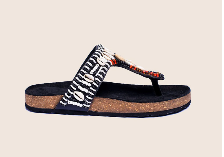 The cork footbed is synonymous with exceptional comfort, the word "footbed" was first used by Birkenstock in the 1930s to describe anatomically shaped inner soles with special support elements. We have found suppliers who can give us these exceptionally comfortable footbeds and we use the centuries old Maasai beadwork to give it a touch of glamour.