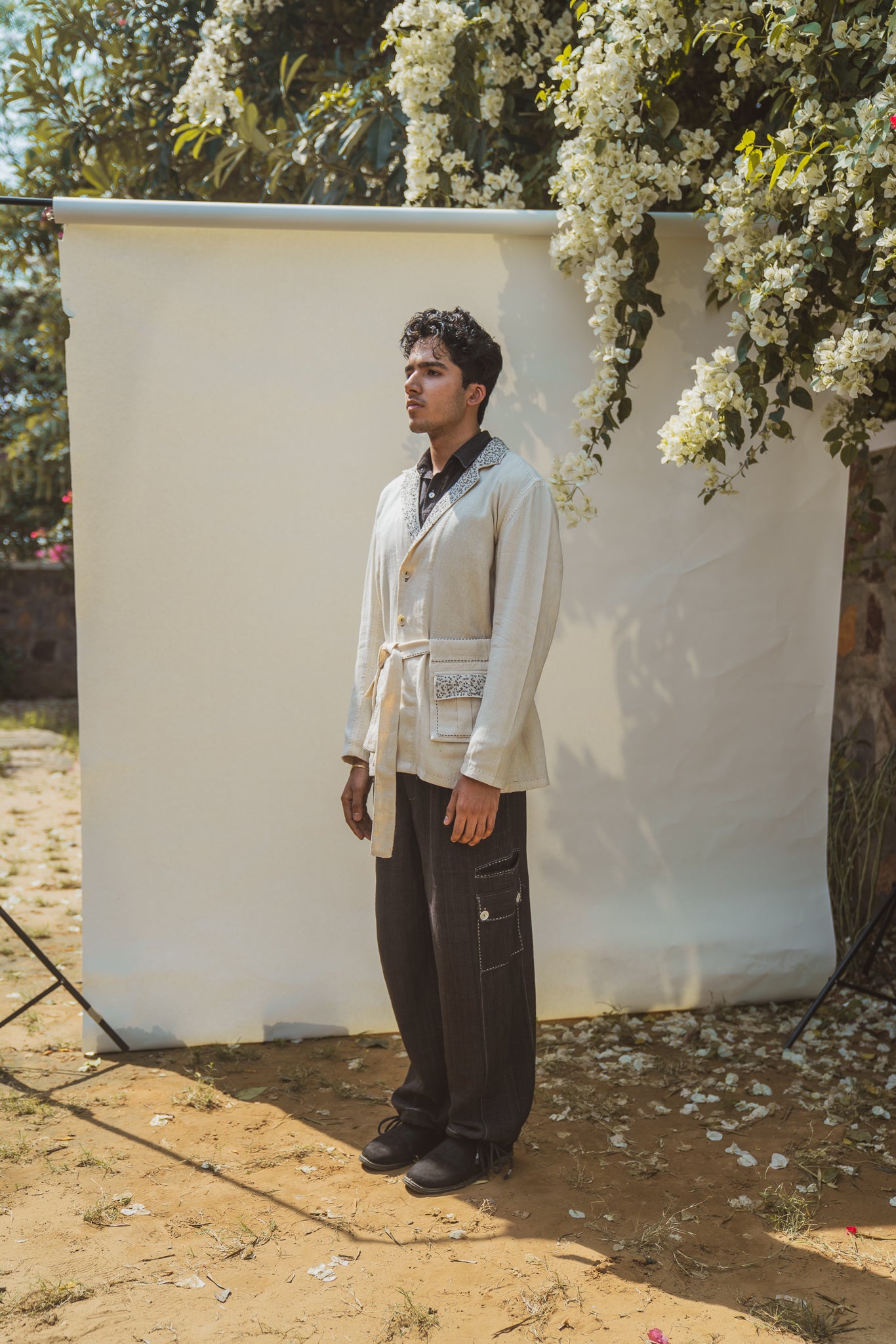 The Sonder Unisex Blazer comes in a calm and soothing colour that we call Kora. A classic blazer silhouette that fits into any occasion. Crafted in 100% cotton fibres and natural materials. This Twill cotton double breasted jacket is undyed and unbleached. It has a peak lapel, welt pockets and a three-closure button front. The lapels are adorned with a contemporary take on classic running stitches and French knots.