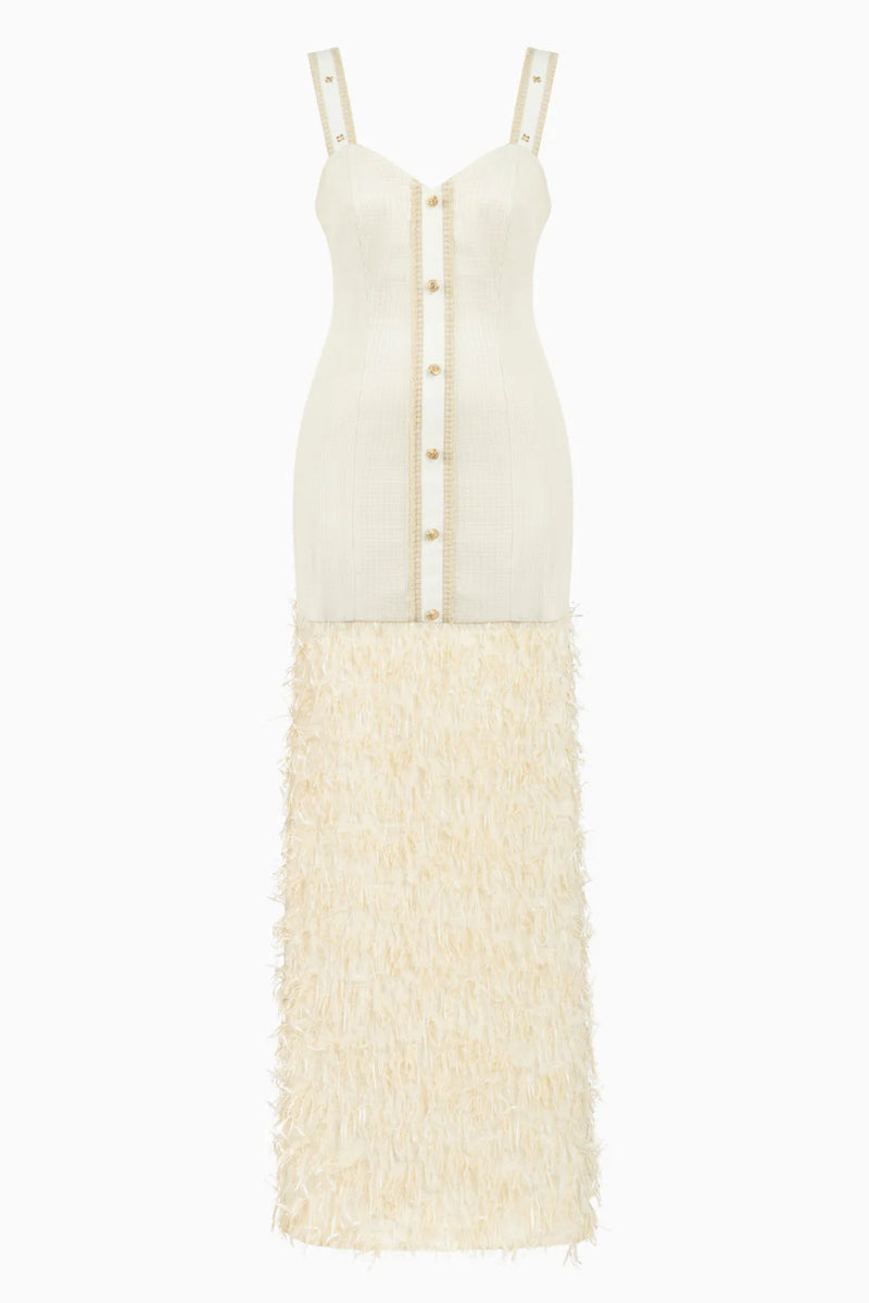 has a rich texture that feels both ethereal and grounded. Its flowing silhouette, gold-buttoned front, and feathered hem detailing
