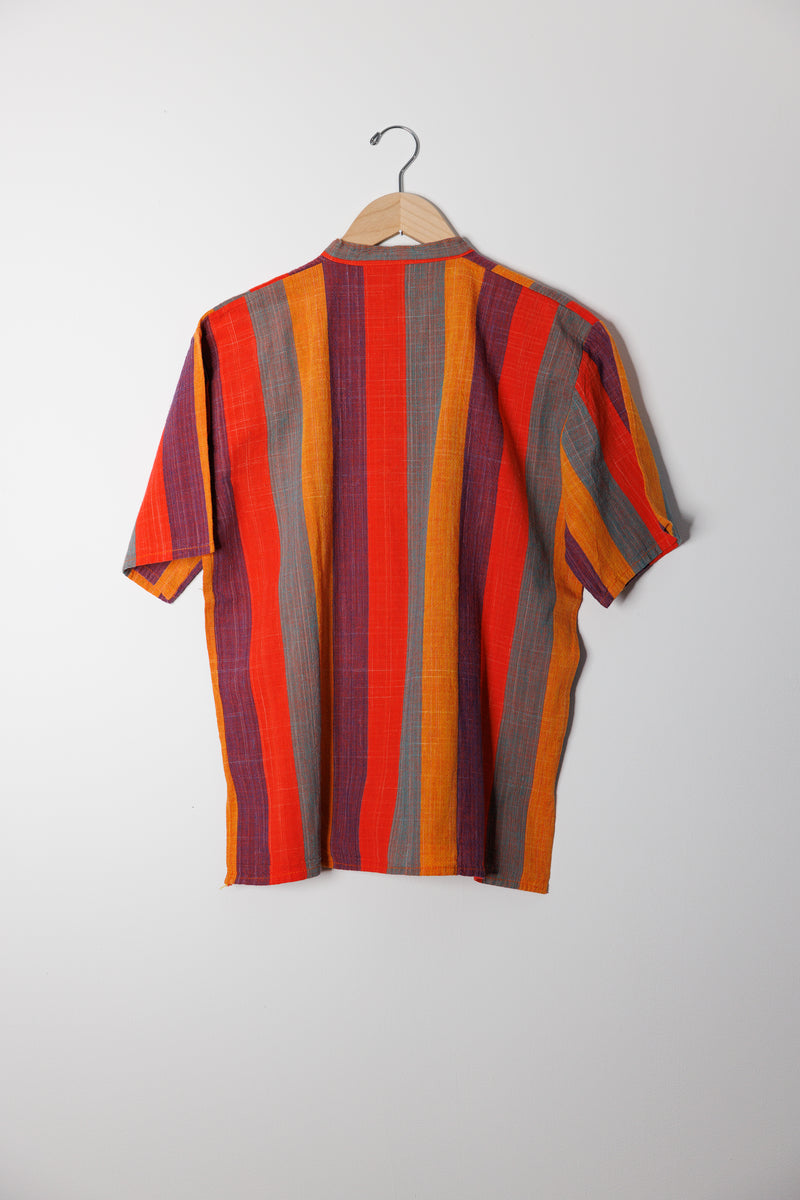 Oversized collarless tunic top, made in deadstock cotton, hand woven and printed on the island of Paros in Greece. Short sleeve, button front opening and single pocket details, along with side slit details at the hem.