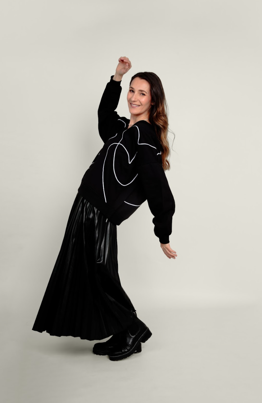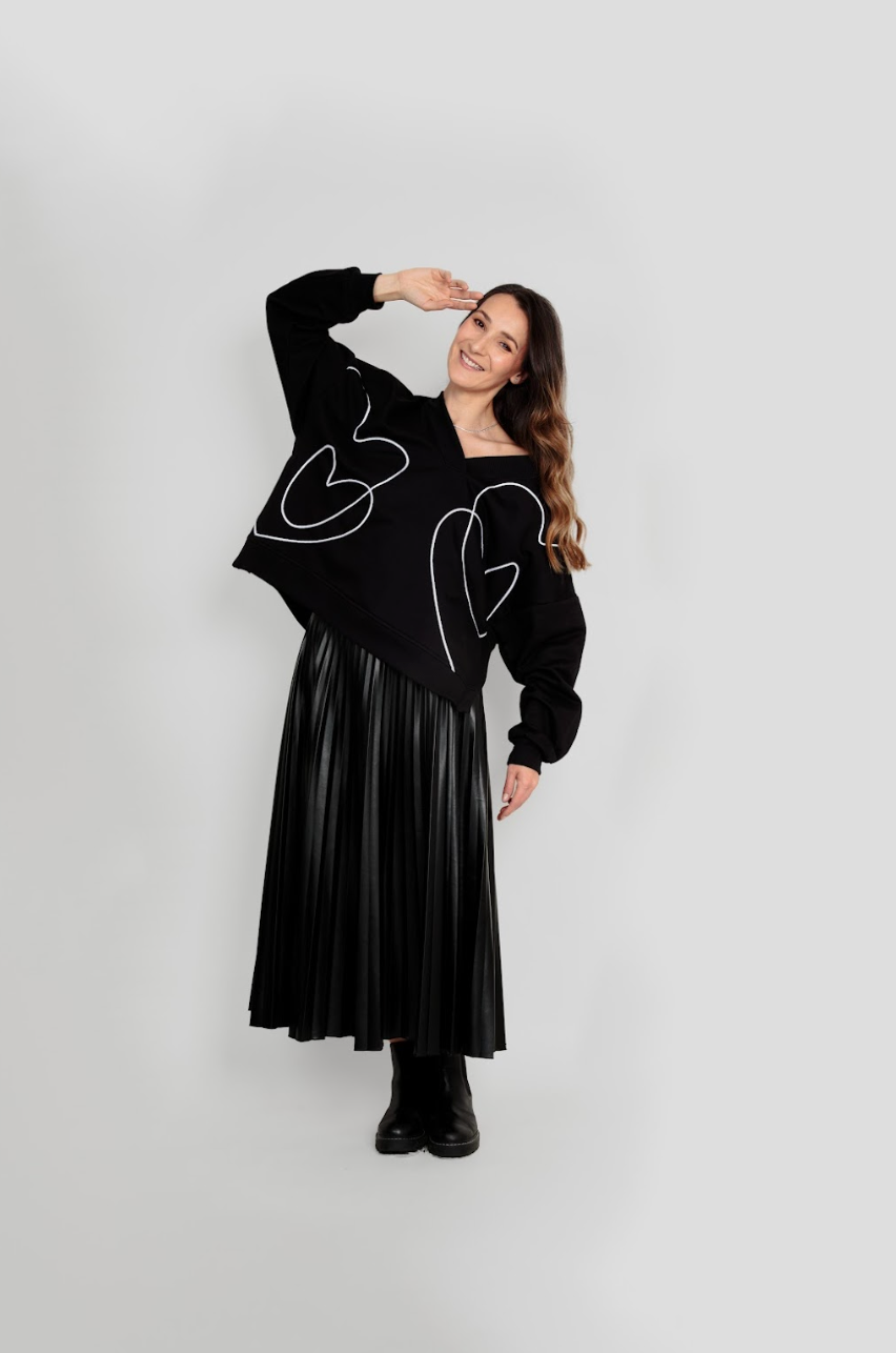 This black oversized sweatshirt features a V-neck, long sleeves, and side zippers. It has white machine embroidery on both the front and back.