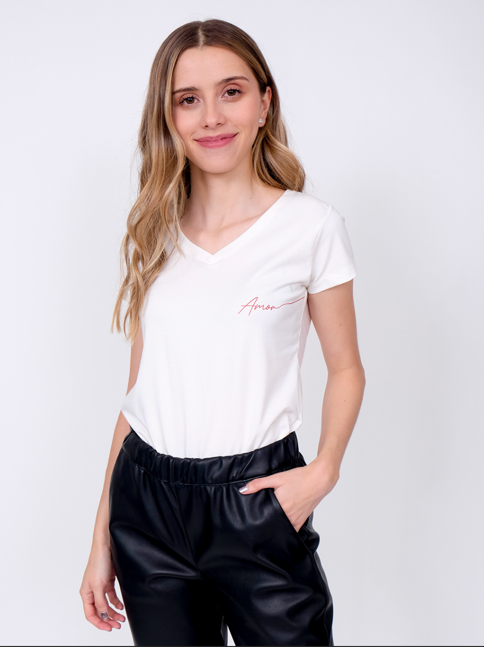 This ivory V-neck t-shirt features an anatomical heart print on the front and back, with the word "love" in various languages. The model is 5'6" (167 cm) and is wearing a size XS.