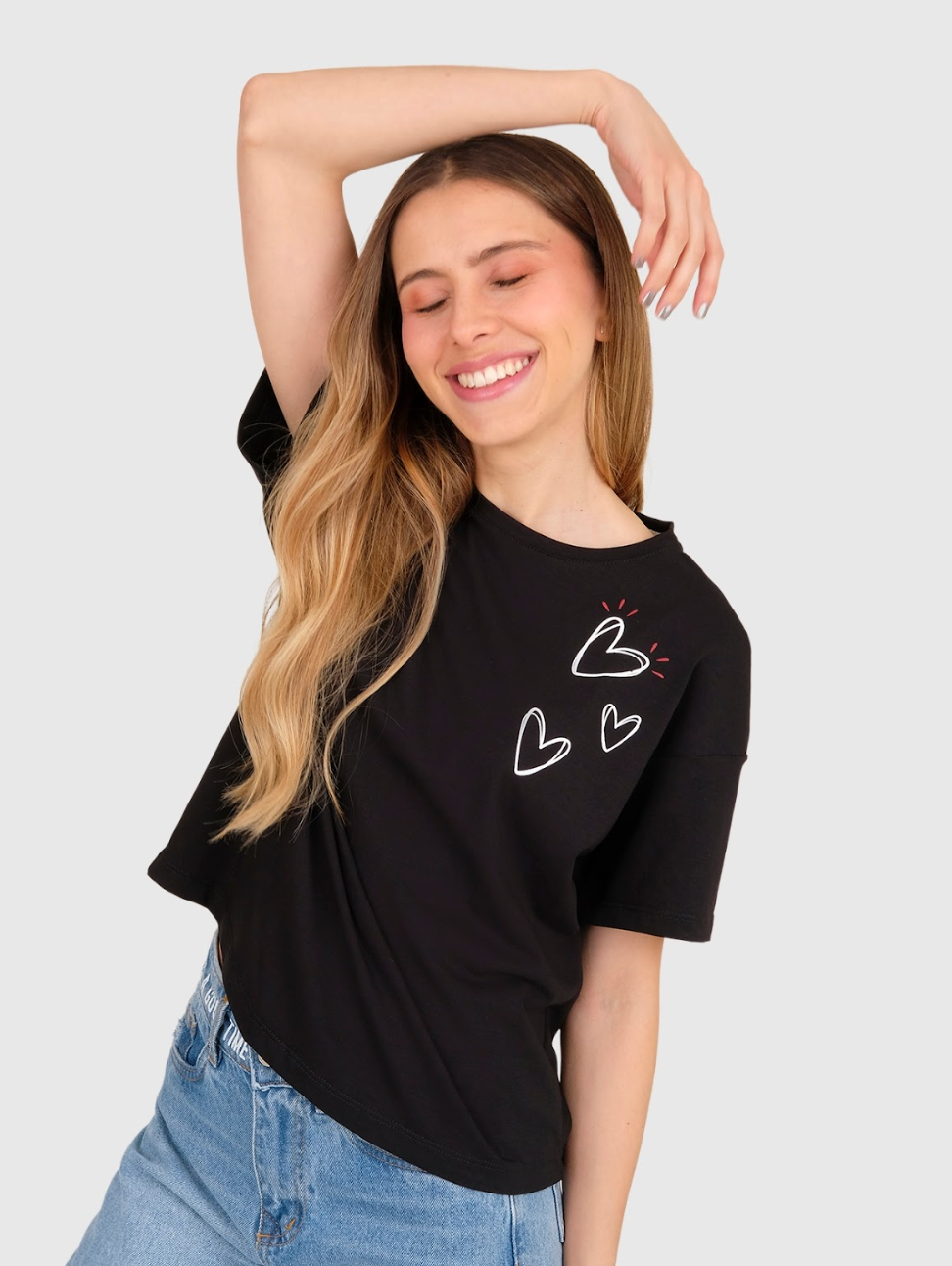 This black round-neck t-shirt features short sleeves and an oversized fit. The model is wearing a size XS.