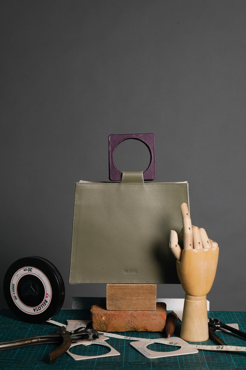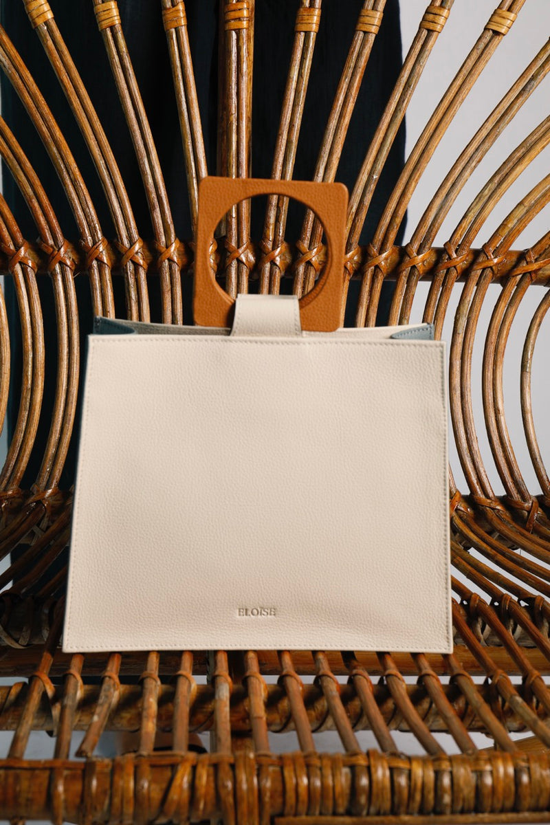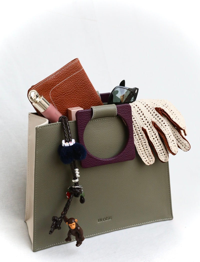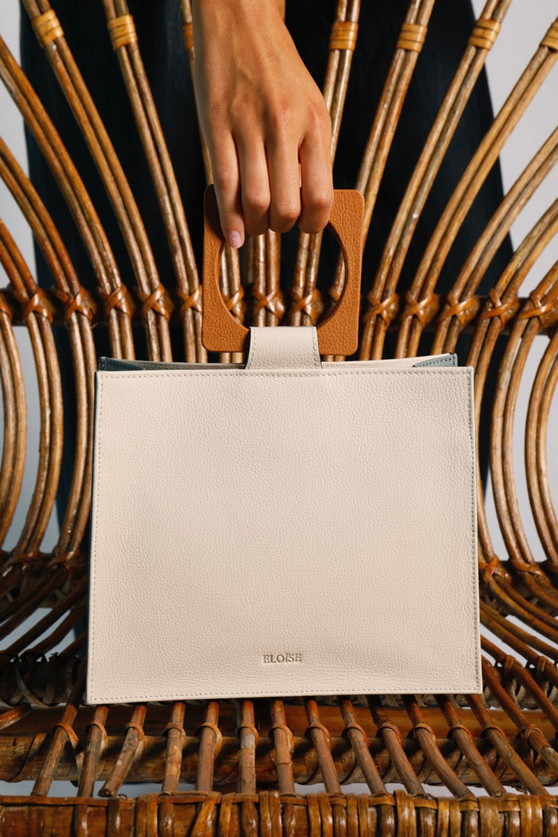 This bag can be worn on the shoulder, crossbody, or by hand, with a leather-covered handle. The interior features two pockets, one with a zipper. It has an adjustable and removable shoulder strap. Discreet magnetic closure. The interior is lined with a raw-colored herringbone resin fabric.
