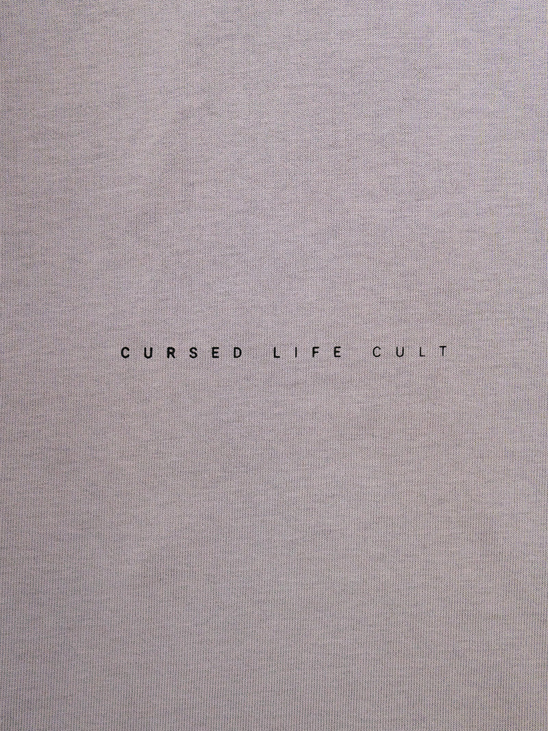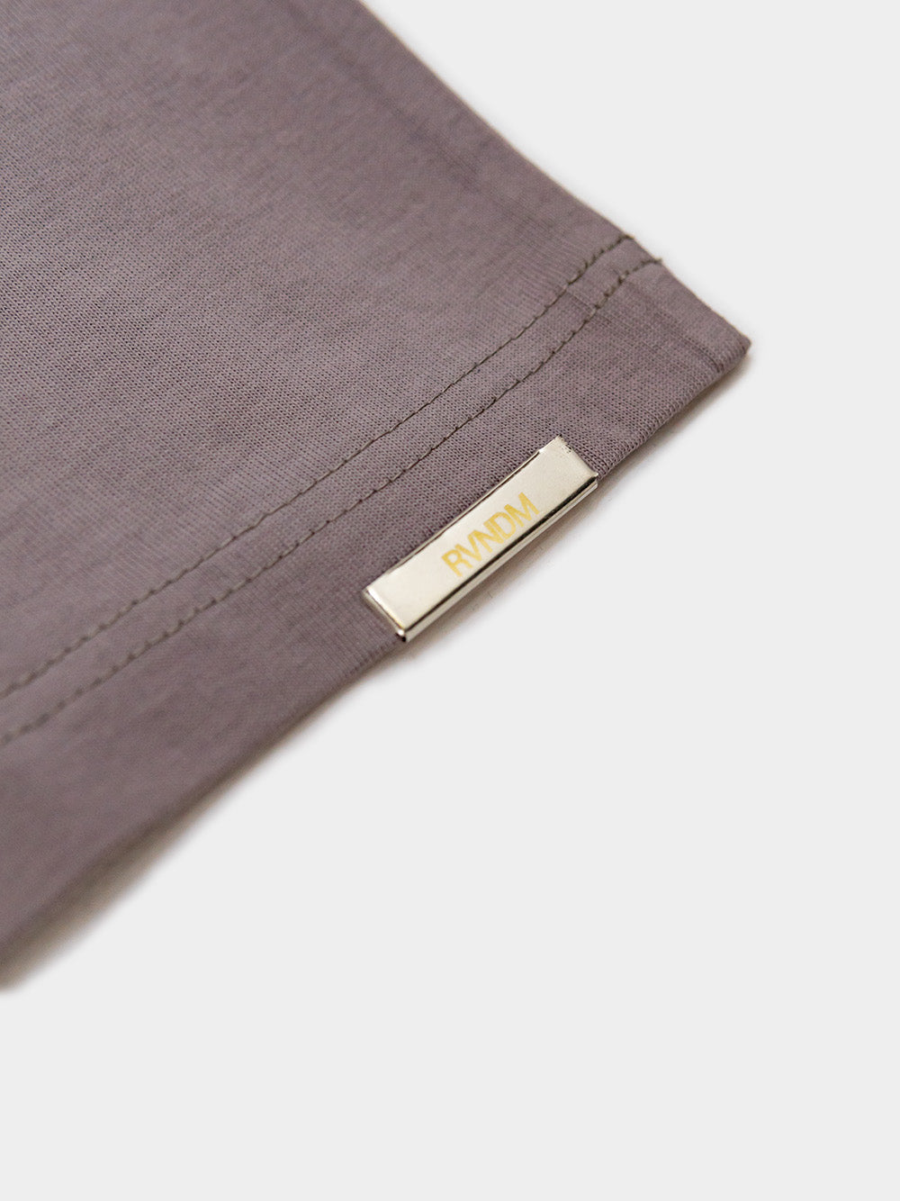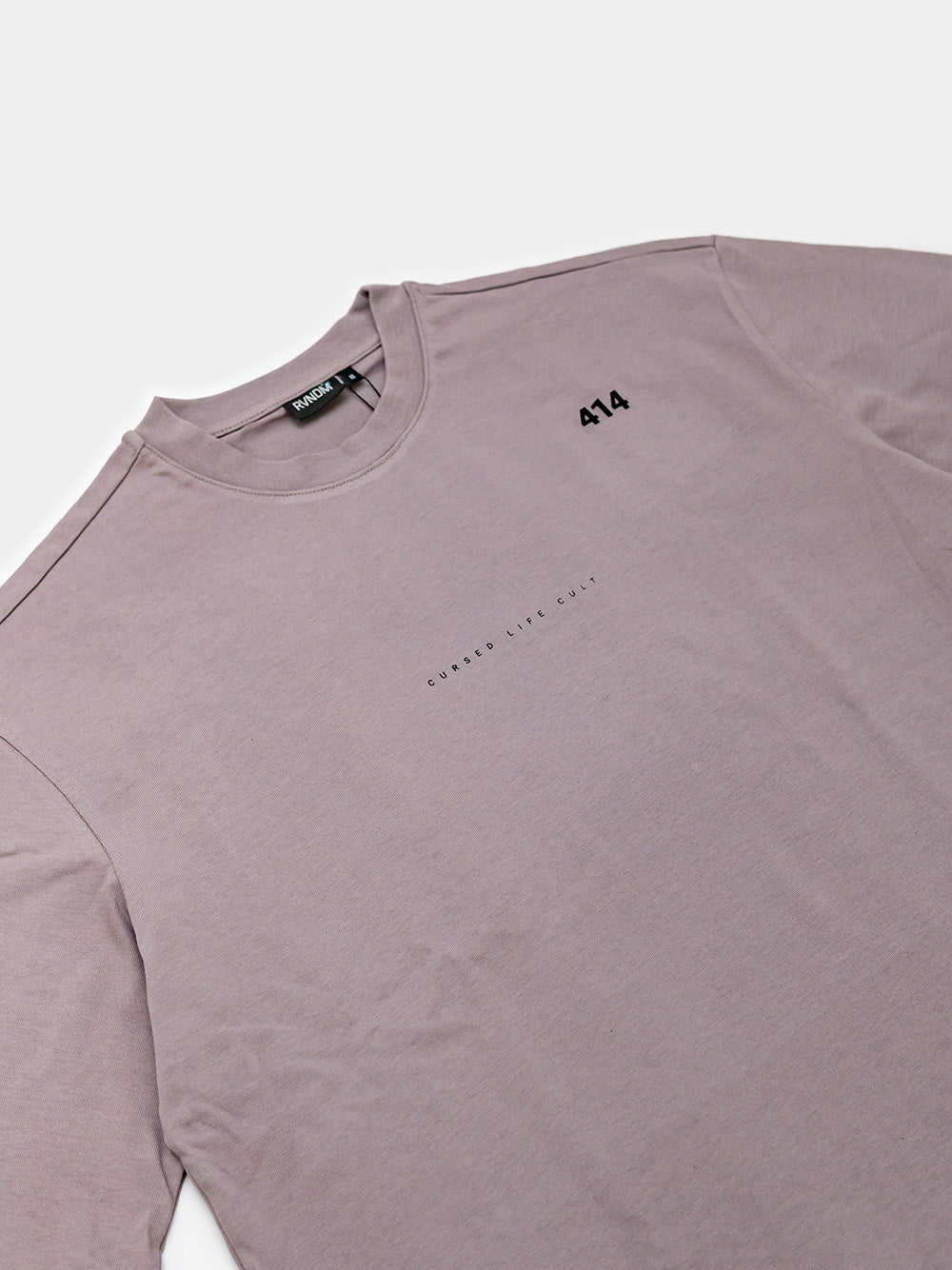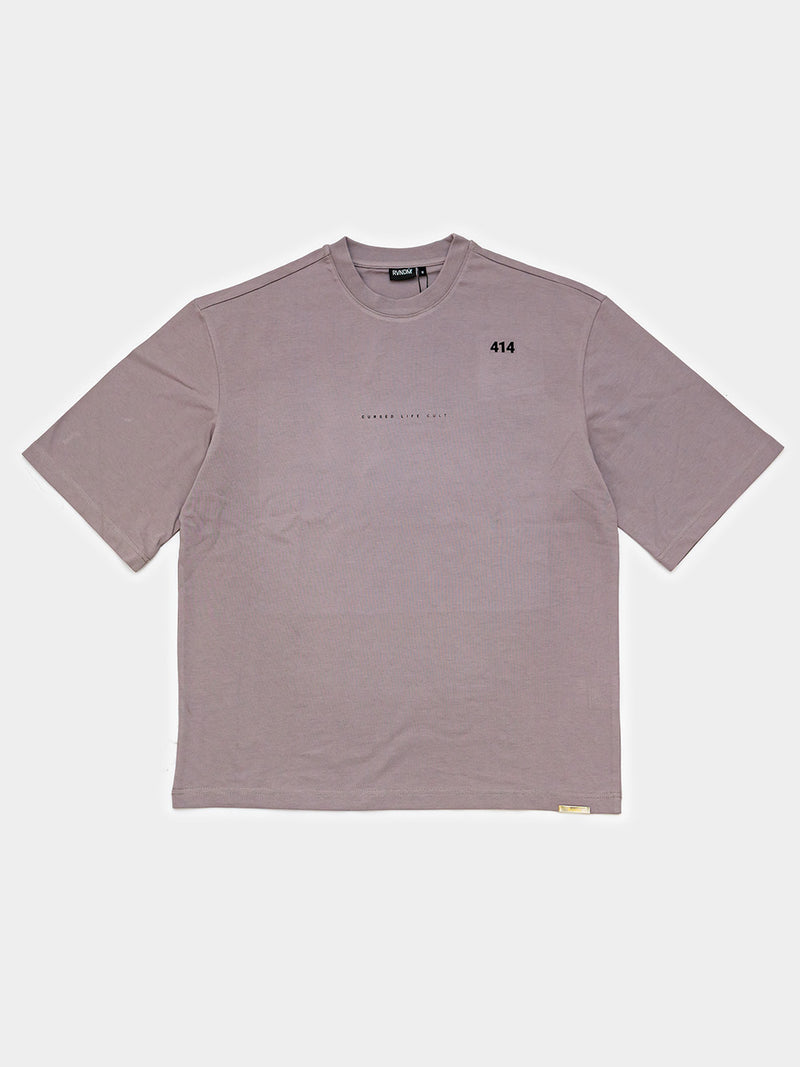 Gray oversized boxy T-Shirt with wide sleeves and a metallabel attached to the bottom.