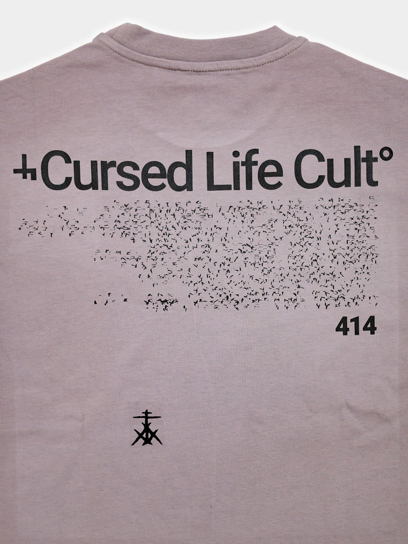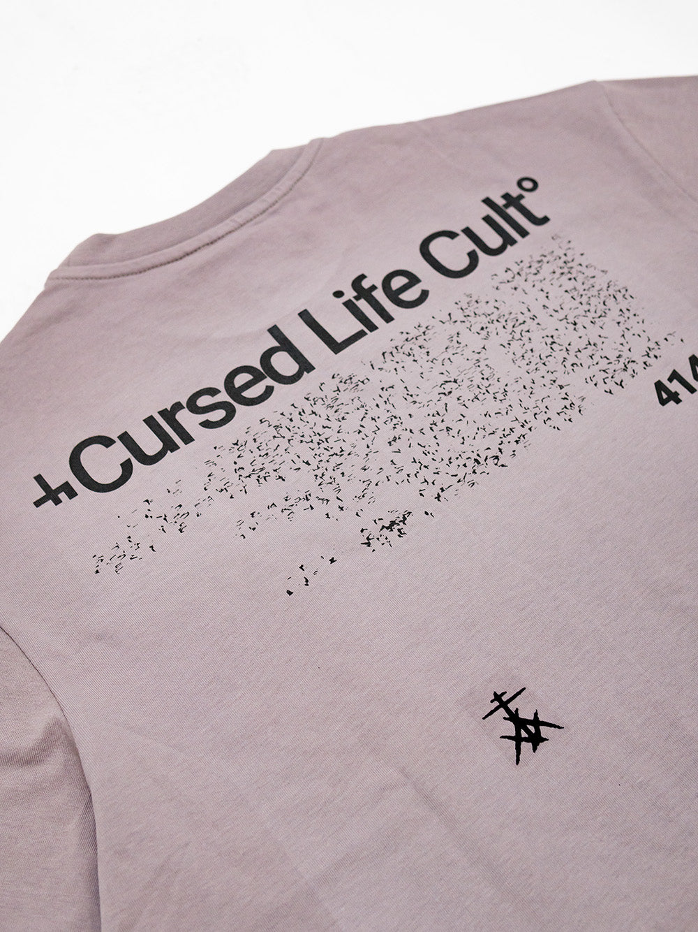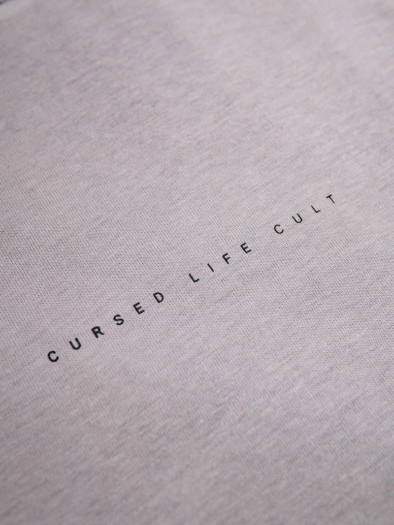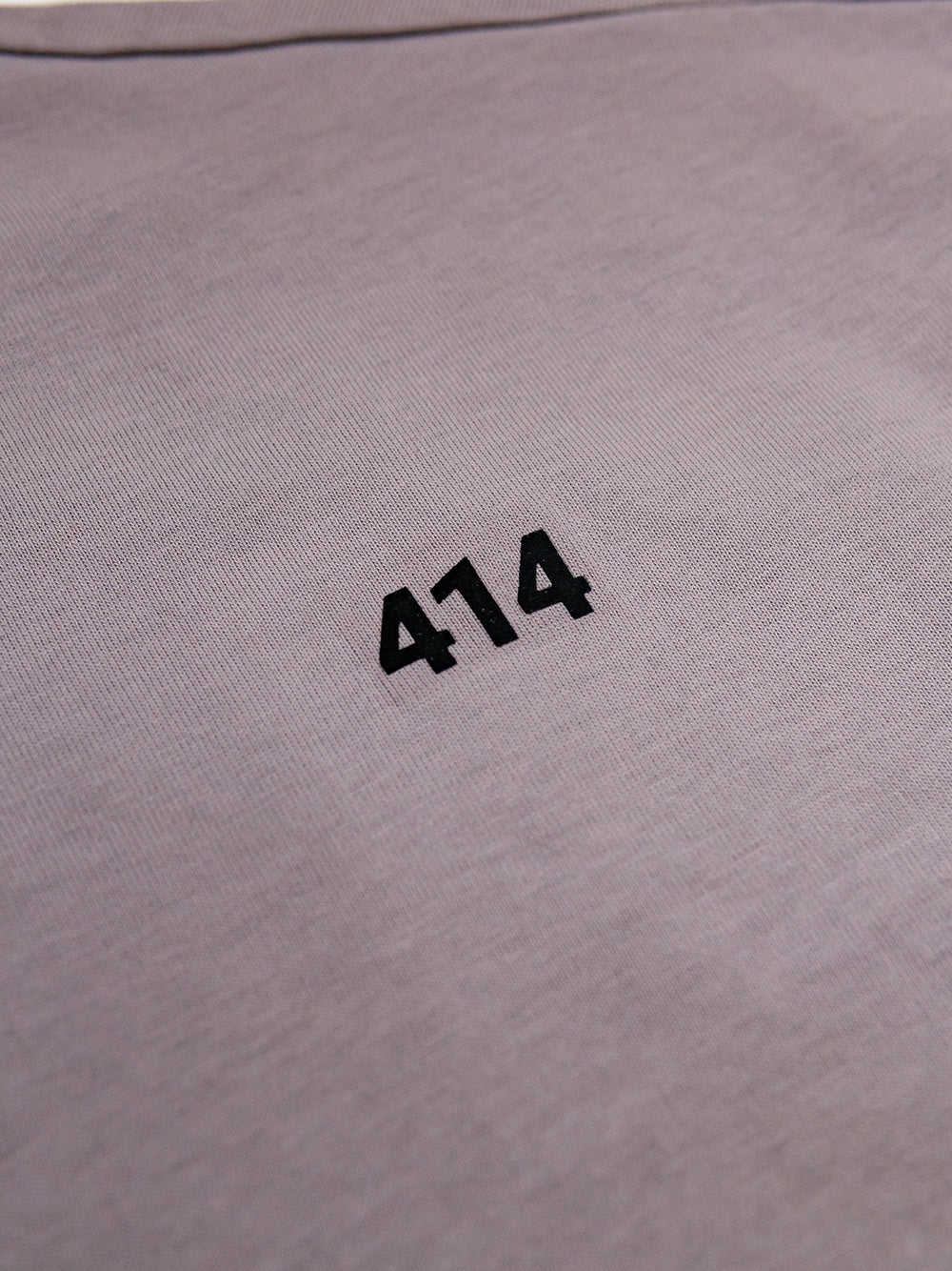 Gray oversized boxy T-Shirt with wide sleeves and a metallabel attached to the bottom.