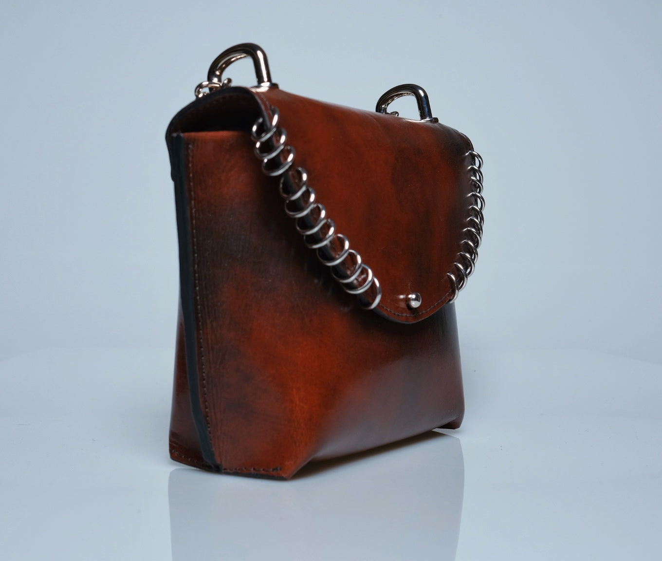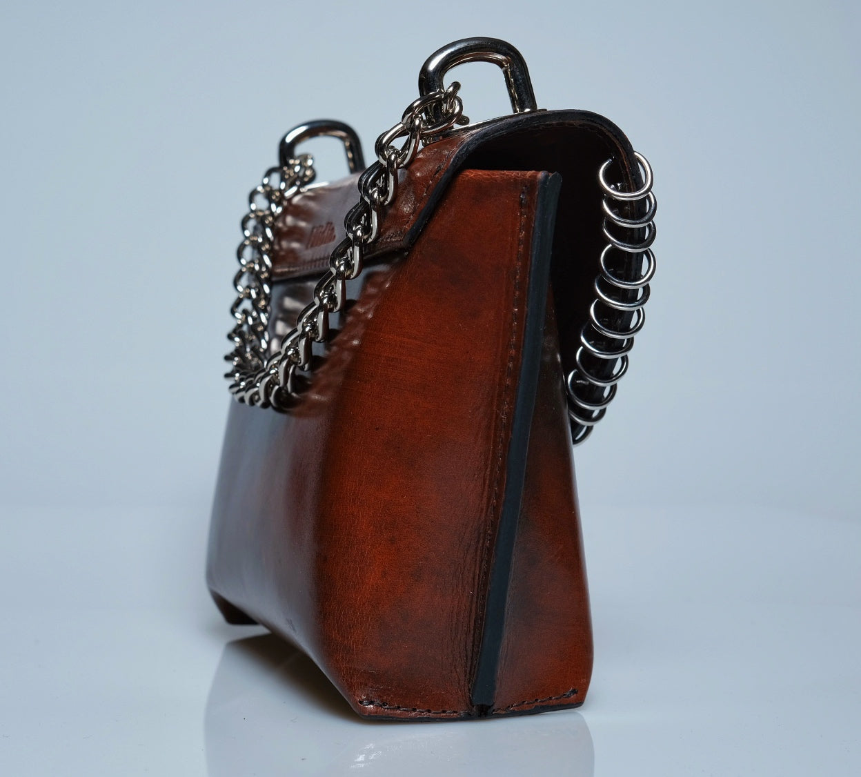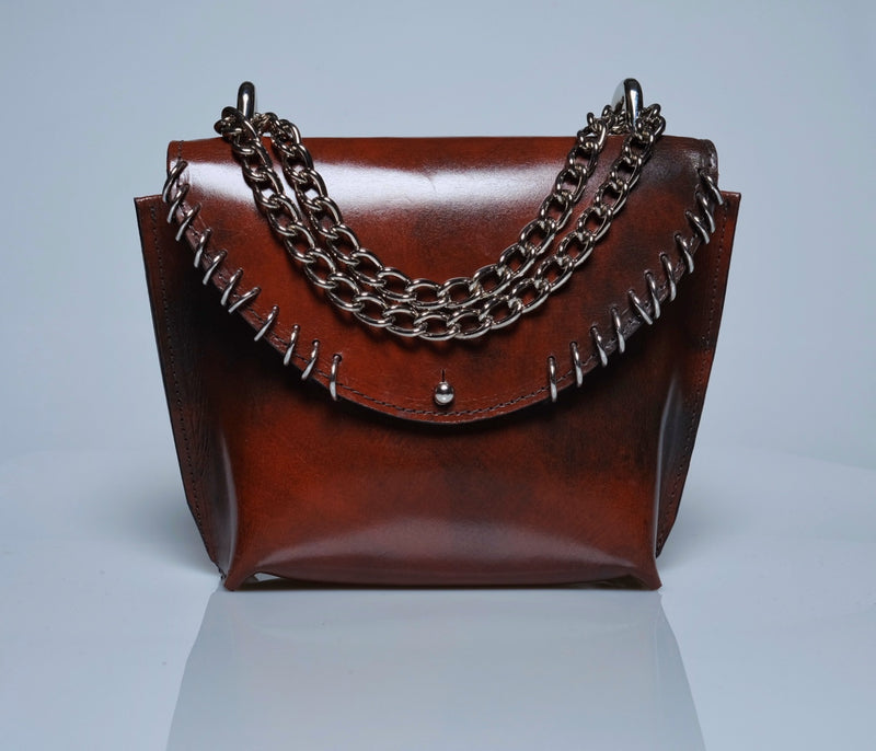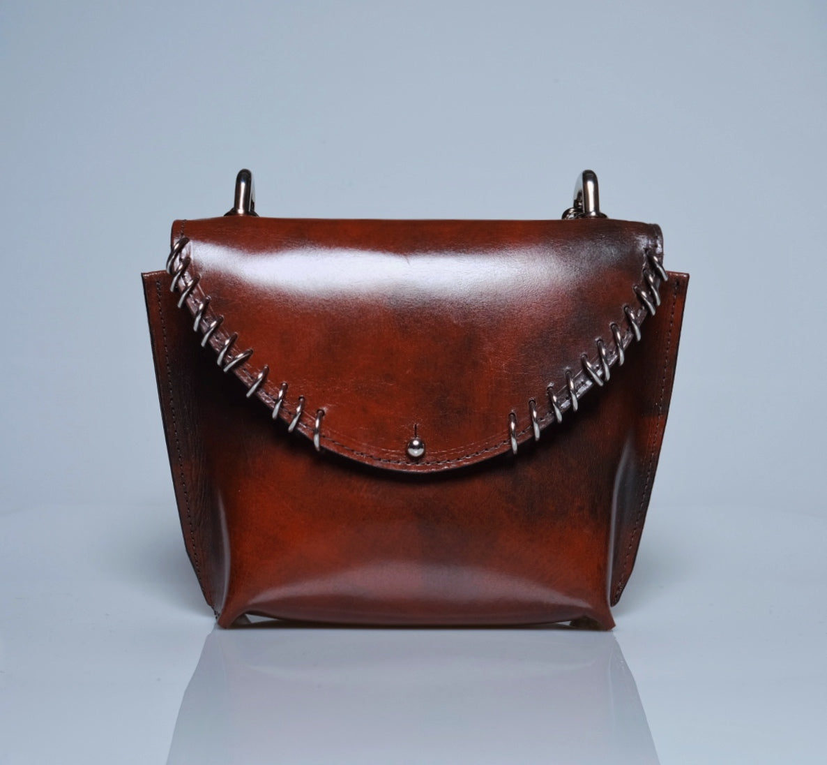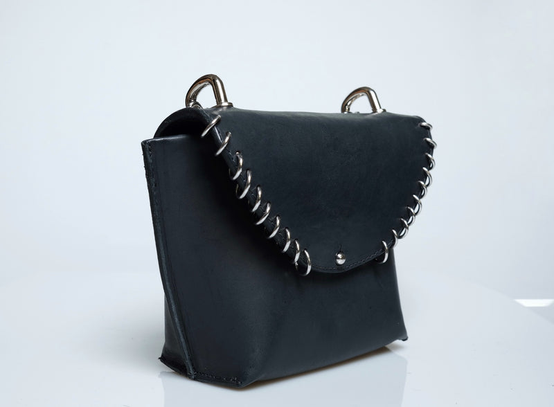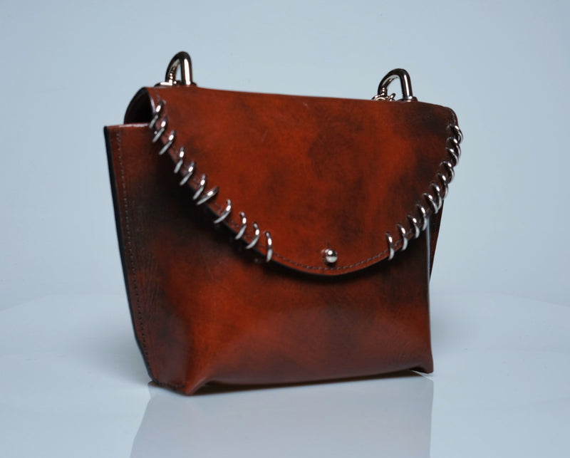 This handmade mini leather purse is a perfect blend of style and craftsmanship. Made from high-quality leather, sustainably tanned with vegetable oils, it features a sleek, compact design ideal for carrying essentials while adding a touch of edge to any outfit. The purse is adorned with silver rings, giving it a subtle yet bold edge. Whether you're heading out for a night on the town or just need a stylish accessory for your everyday look, this purse is sure to make a statement with its timeless appeal and attention to detail.Total Height 6 1/2 in. Width at top 8 in. Width at bottom 5 in Depth at bottom 3 in