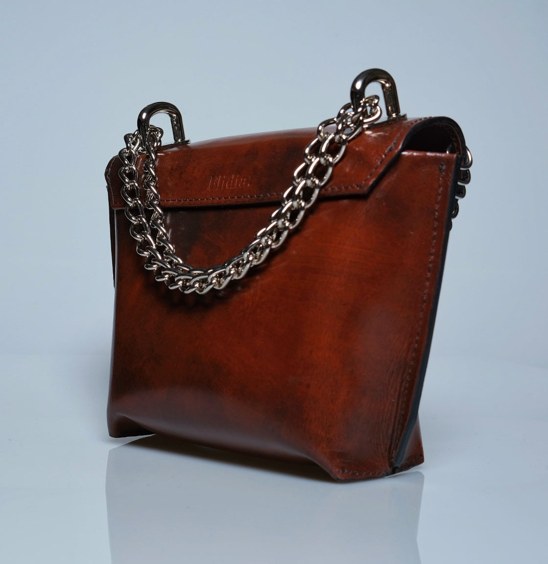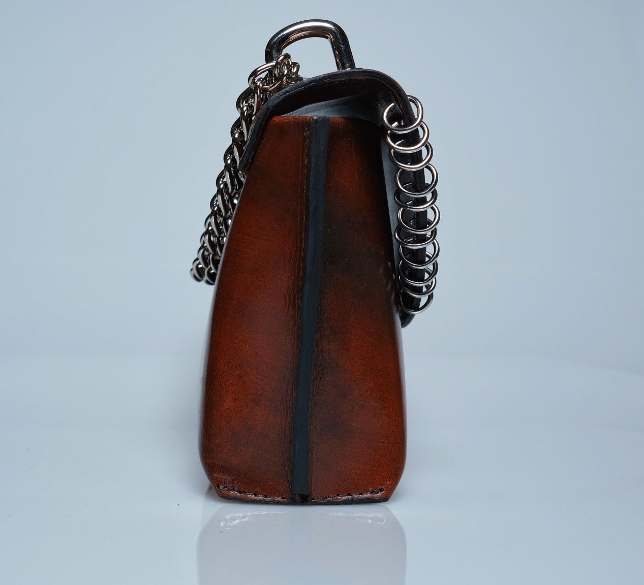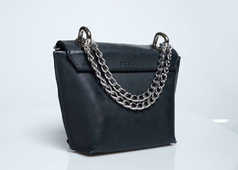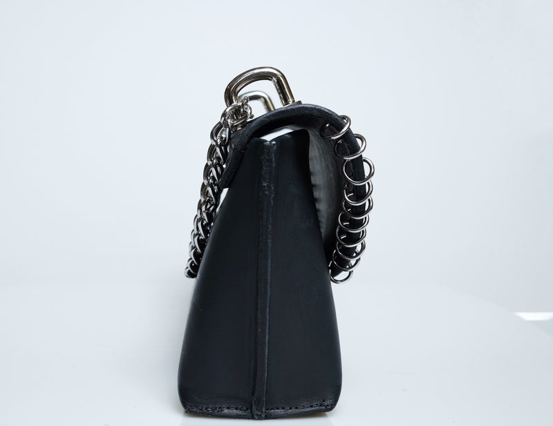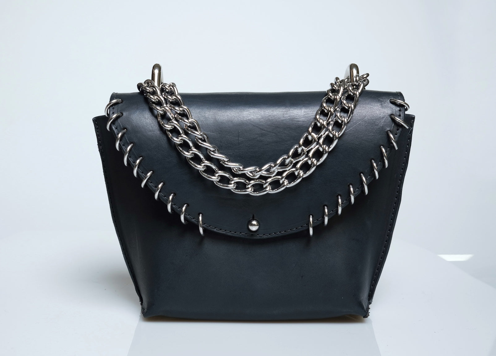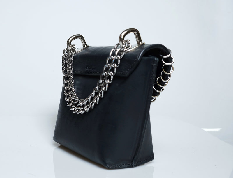 This handmade mini leather purse is a perfect blend of style and craftsmanship. Made from high-quality leather, sustainably tanned with vegetable oils, it features a sleek, compact design ideal for carrying essentials while adding a touch of edge to any outfit. The purse is adorned with silver rings, giving it a subtle yet bold edge. Whether you're heading out for a night on the town or just need a stylish accessory for your everyday look, this purse is sure to make a statement with its timeless appeal and attention to detail.Total Height 6 1/2 in. Width at top 8 in. Width at bottom 5 in Depth at bottom 3 in