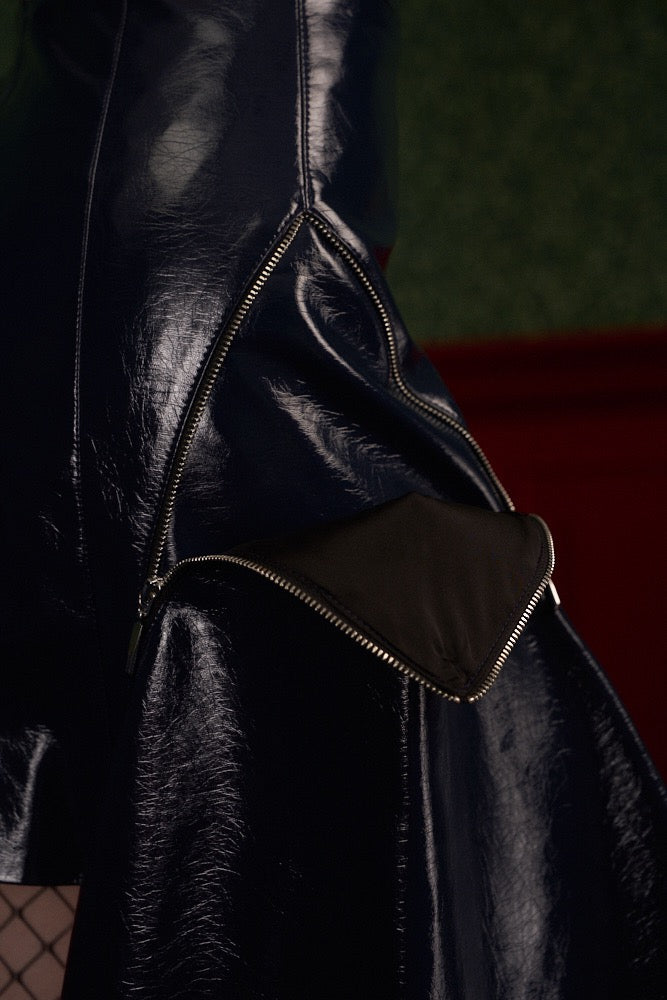 This is your new armor: a versatile skirt that’s provocative, powerful, and utterly unique. Part of a capsule set with a matching jacket. Features a unique, full-length zipper running down the front panel, allowing three distinct styling options: fully zipped, partially unzipped for a touch of defiance, or completely removed.