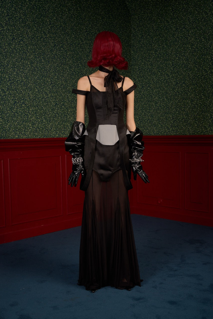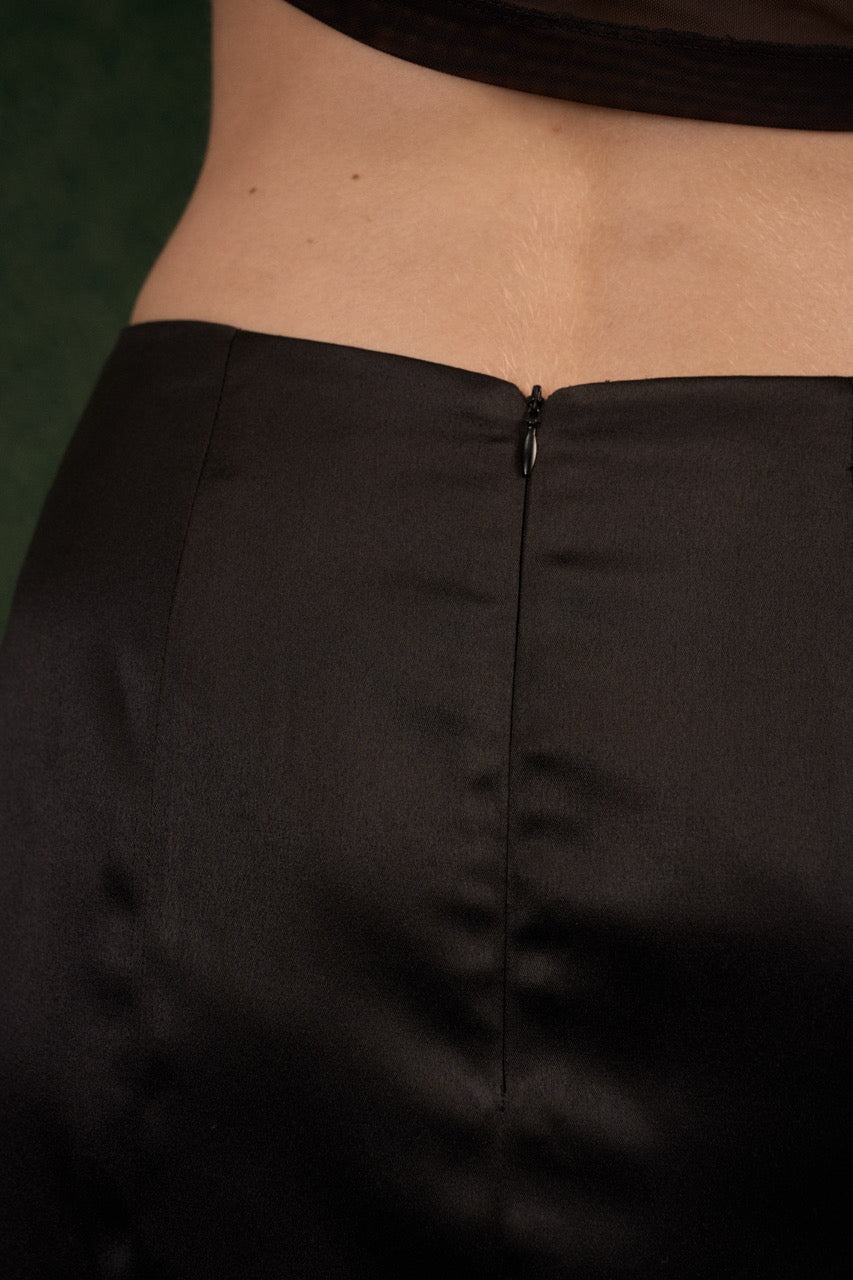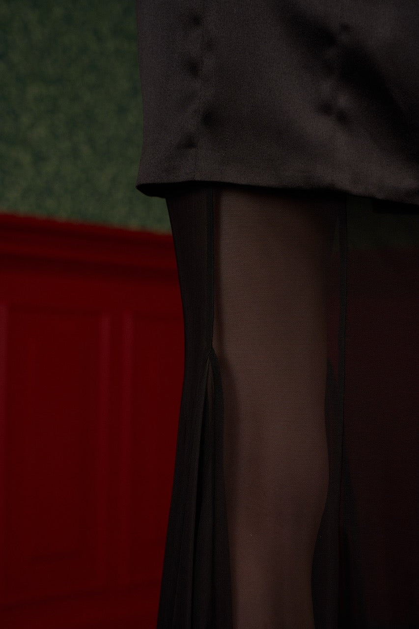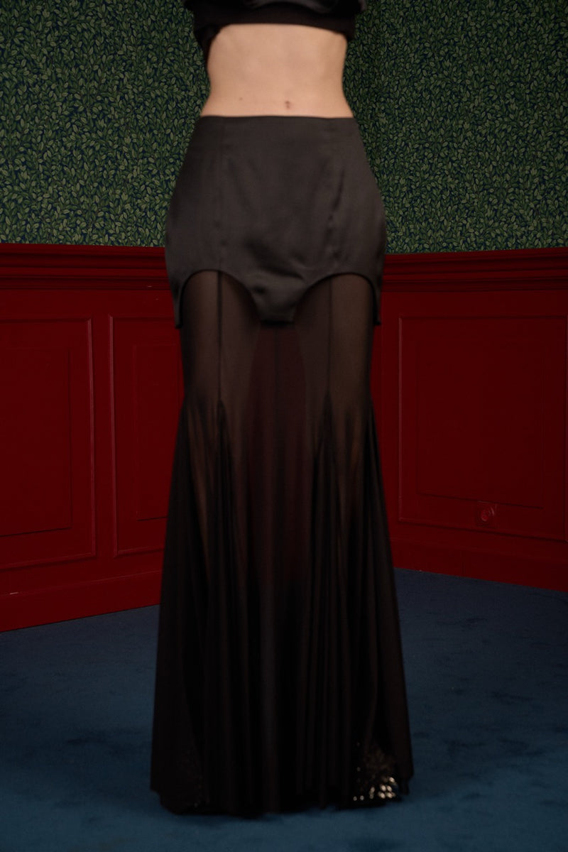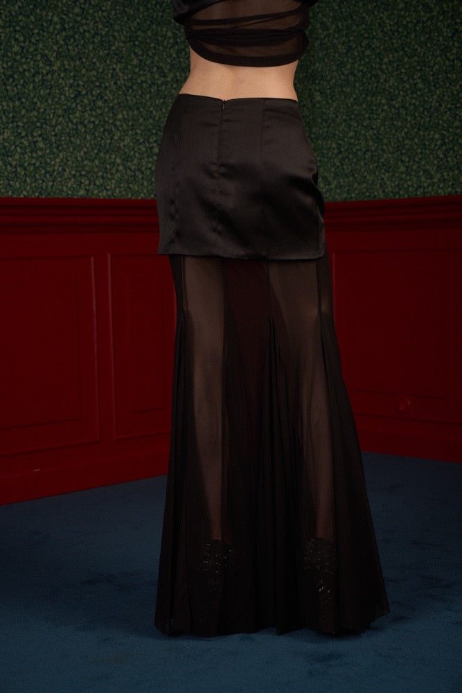 The Queen Skirt embodies power and seduction — created for women who know that true sensuality is never about exposure, but about control. The sculptural satin mini-panel traces the body's curves, subtly evoking vintage lingerie from the 1930s-40s. The long sheer layer flows from beneath, with defined front seams and godet inserts opening from the knees — revealing movement, mystery, and confidence.