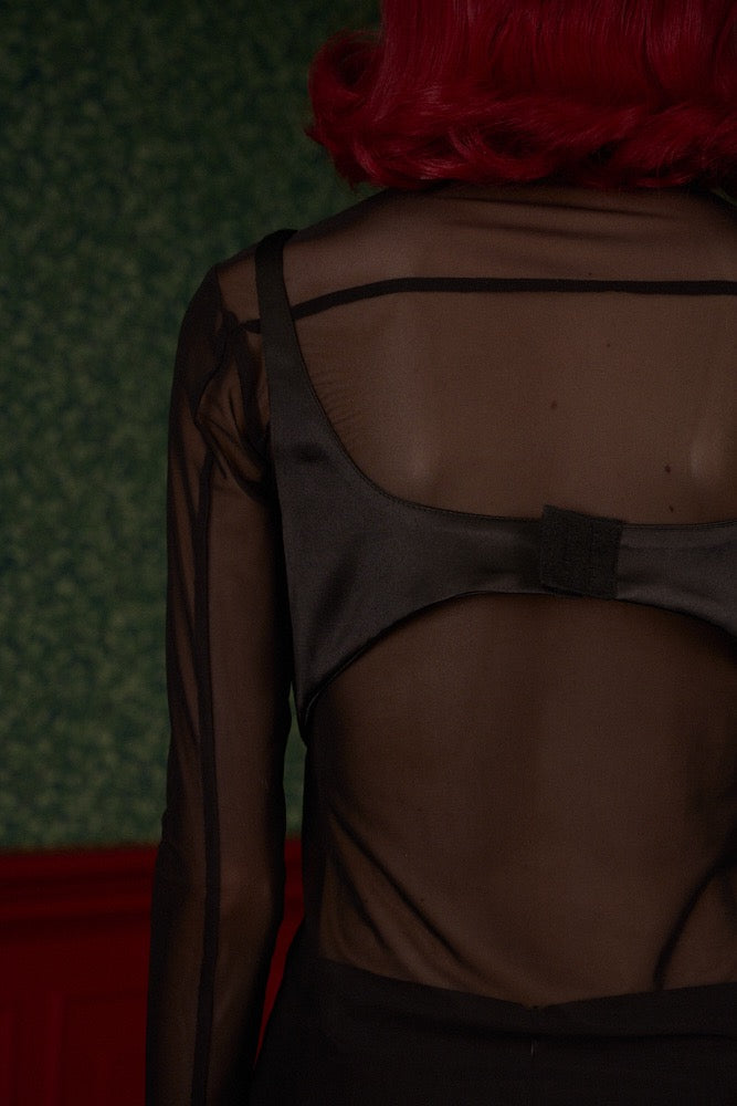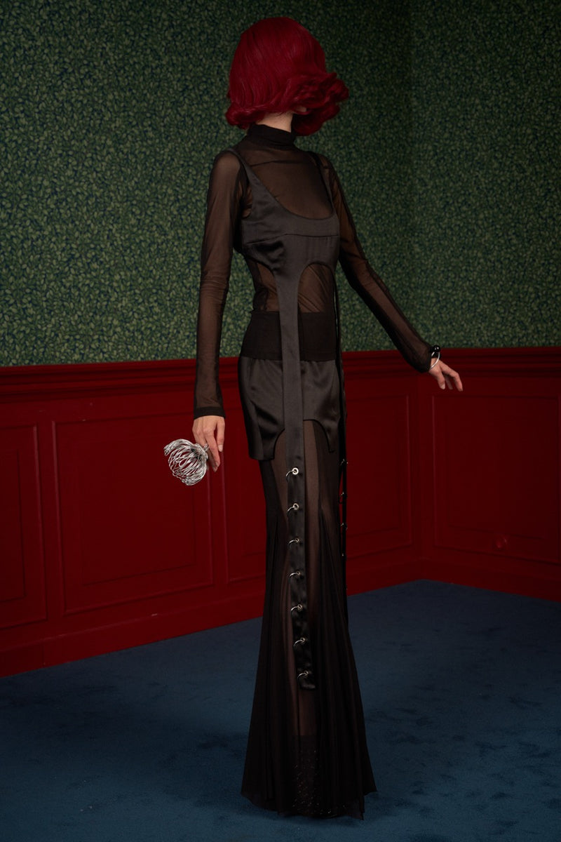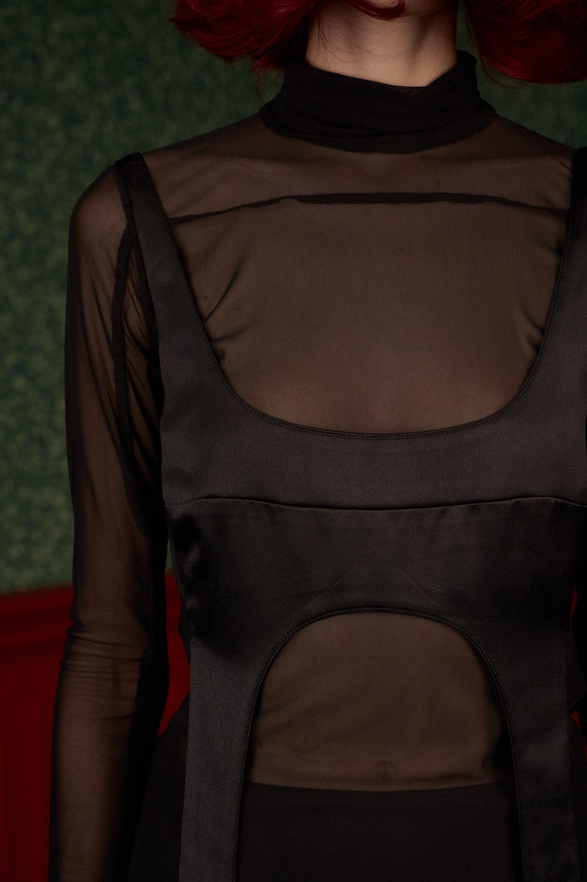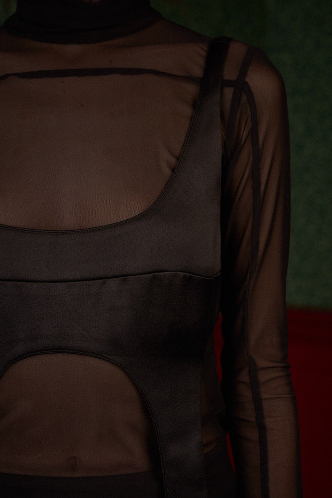 A bold duo of contrasts: a sheer mesh turtleneck that softly follows the body's contours, paired with a rich satin transformable top featuring long adjustable straps with metallic eyelets. You decide how to wear it — wrap the straps around the waist for a sculpted silhouette, tie them loosely for a flowing, dramatic shape, or let them hang free for effortless boldness. Every line, every seam is designed to celebrate the feminine form—the anatomical tailoring follows natural curves, enhancing the body with precision and sensuality.
