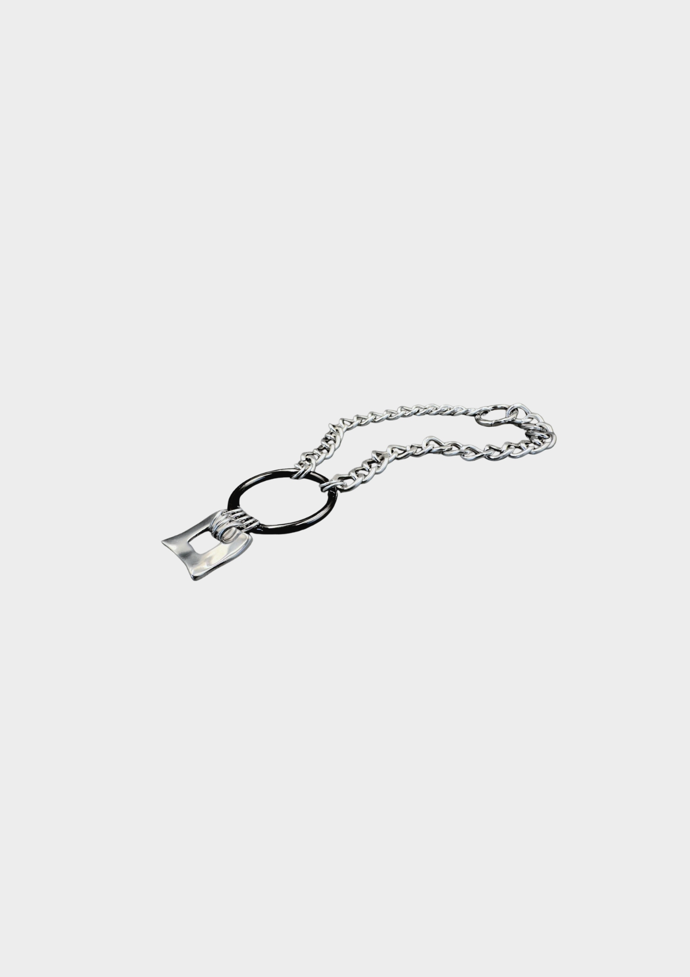 Loop and Edge is contradiction forged into form. A heavy silver-coated box chain drops