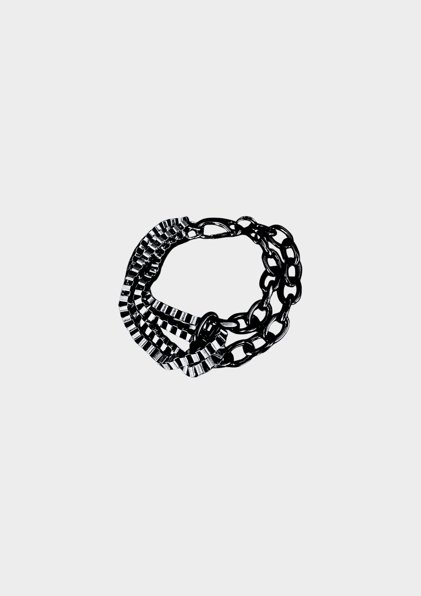 A convergence of contrasts. Fuse unites the strength of structured silver box chains with the raw depth of matte gunmetal links - a statement piece where duality becomes design.