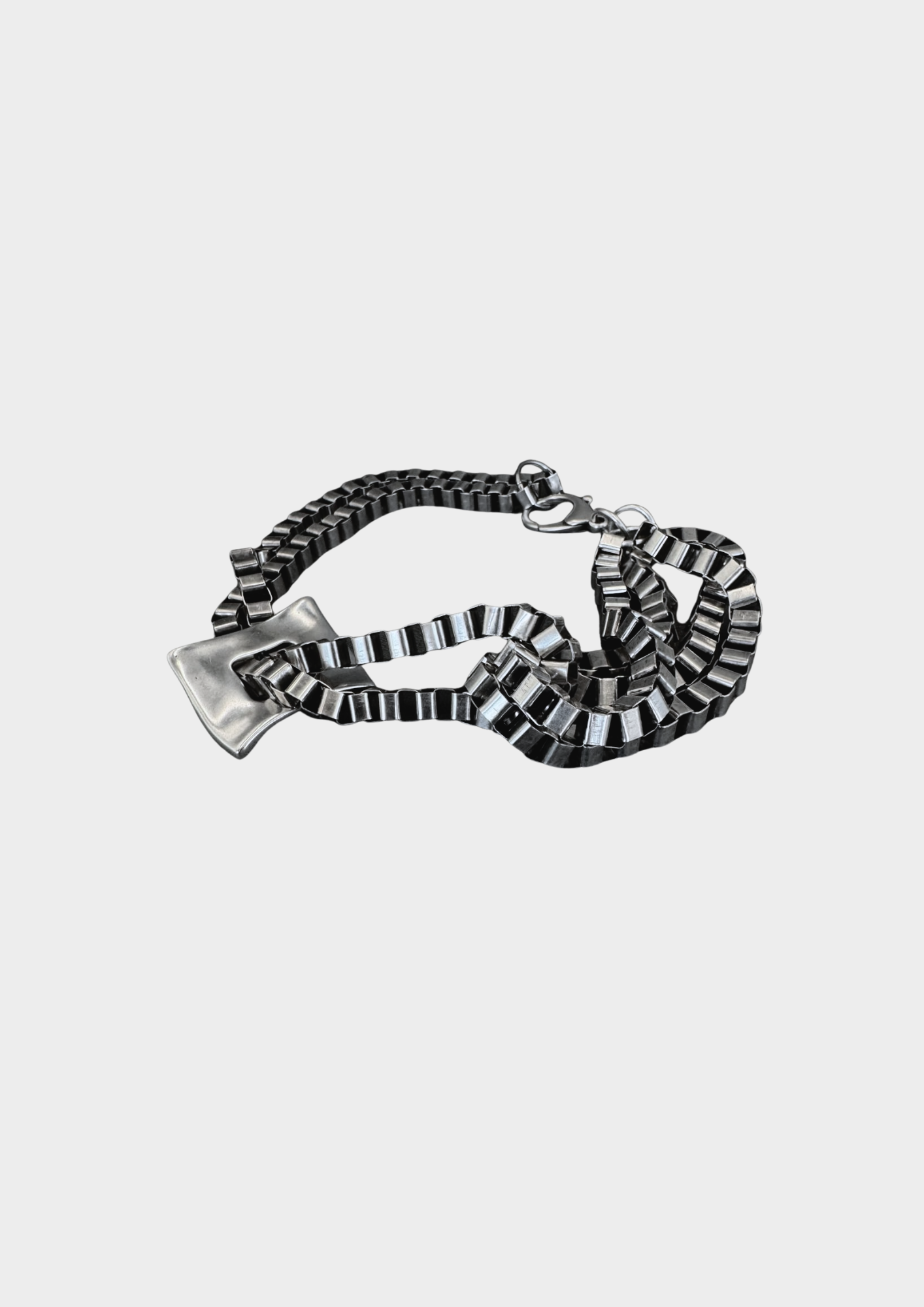 Square Twist is structure unraveled. A chunky silver-coated box chain wraps around a bold square zamak piece, raw and industrial. It’s not smooth – it’s restless, angular, alive with torque.