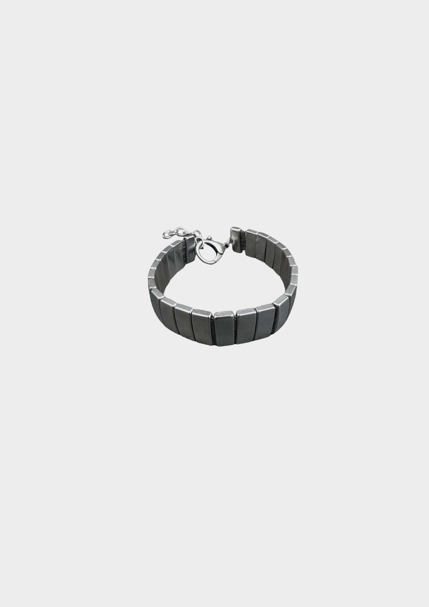 Voltline is electricity forged into form. A rigid choker of silver-coated sliders stacked over a flat metal chain, built to look like current locked into a single, unbroken flow. Clean, sharp, and industrial, it’s a piece that radiates energy even when still.