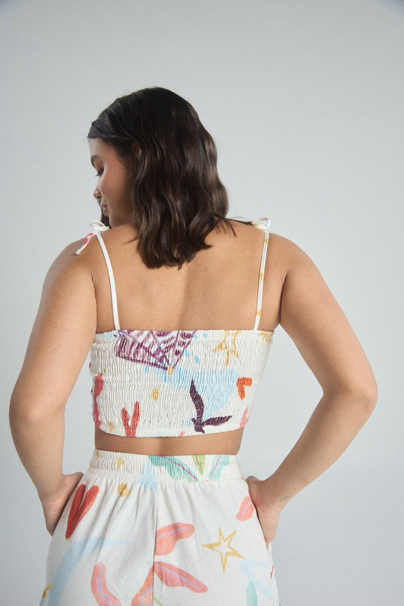 Strappy beach top, printed with our "PARADISE" print, with a sweetheart neckline, gathered front, and a rubberized back.