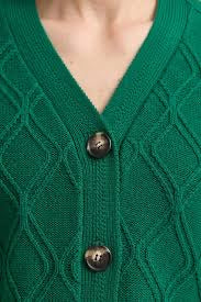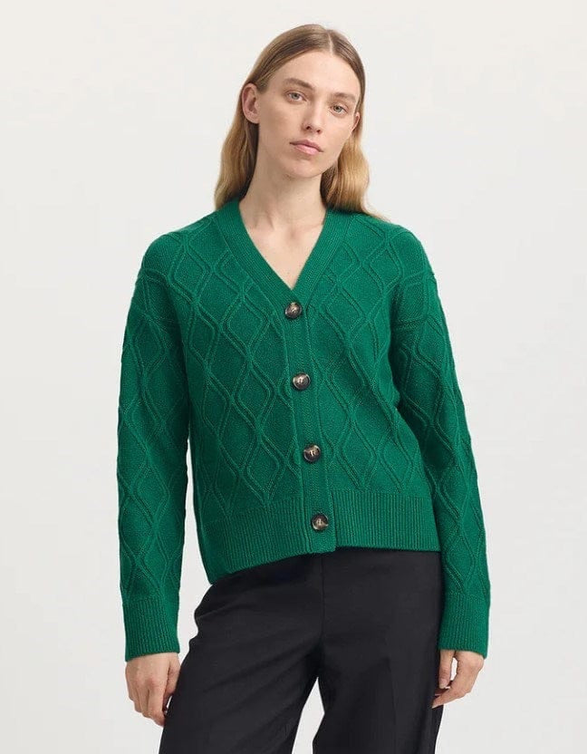 Our Diamond Cable Cardigan features a textured Australian Merino Lambswool cable knit, beginning with a v-neck and button down front and finished with a ribbed trim at the relaxed hem. Available in solid Lush Green or Cardamon accented with a horizontal stripe in Black.