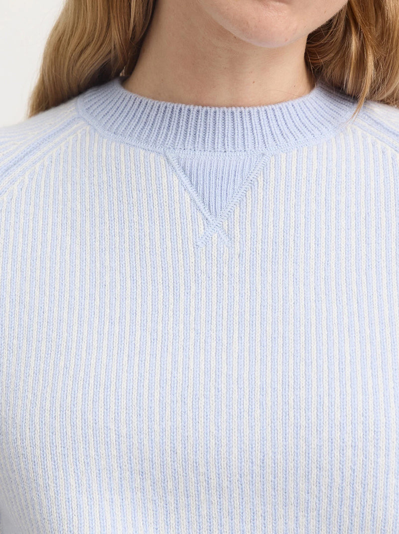 The Pin Stripe Crew has a structured shape textured with a ribbed dual colour stripe made in soft, thick Australian Merino Lambswool. The boxy body is finished with a rib trim on the wrists, hem, and crew neck.