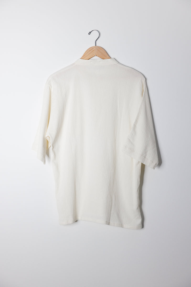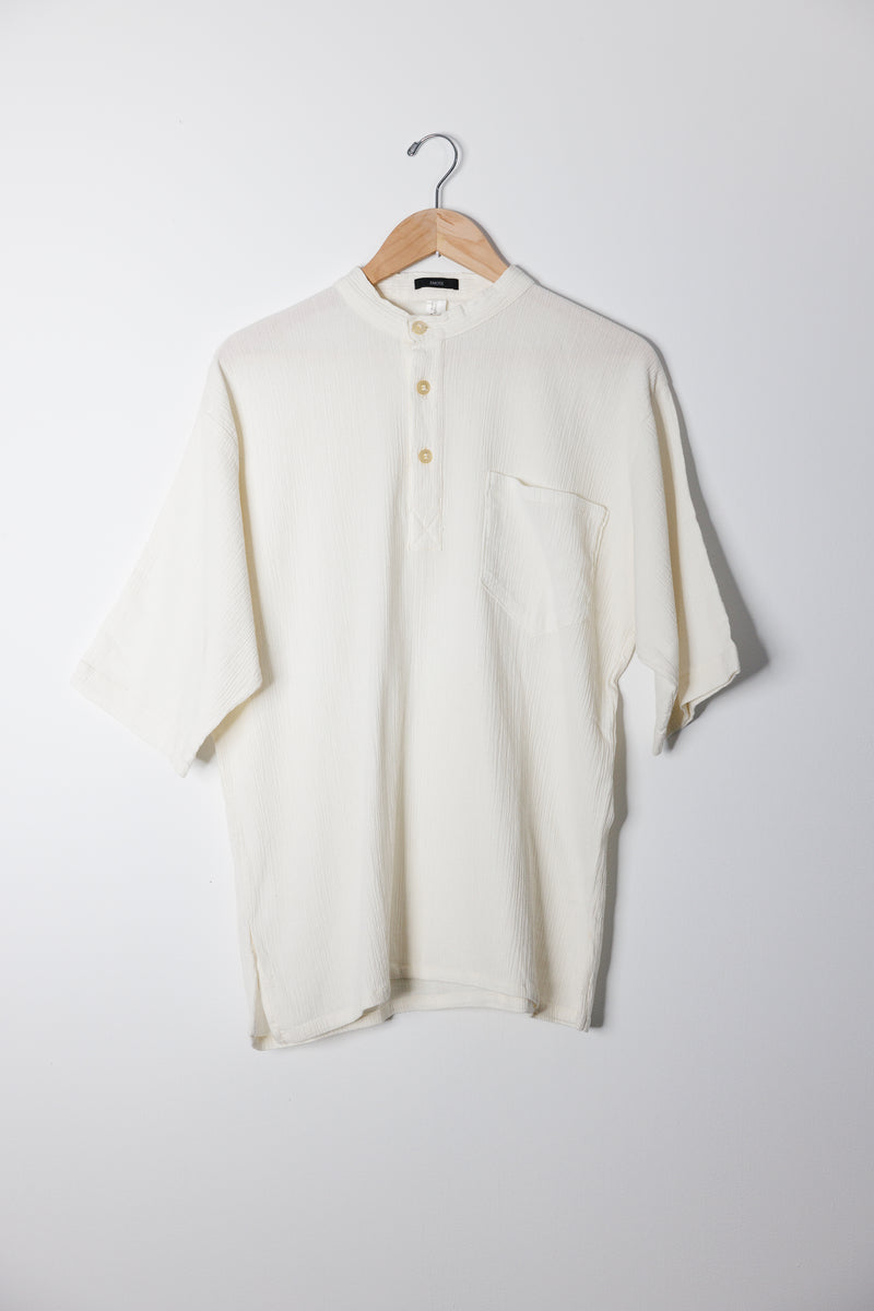 Collarless tunic top, in cotton cheesecloth, handwoven and made on the island of Paros in Greece. Short sleeve button front opening and single pocket details, along with side slit details at the hem.