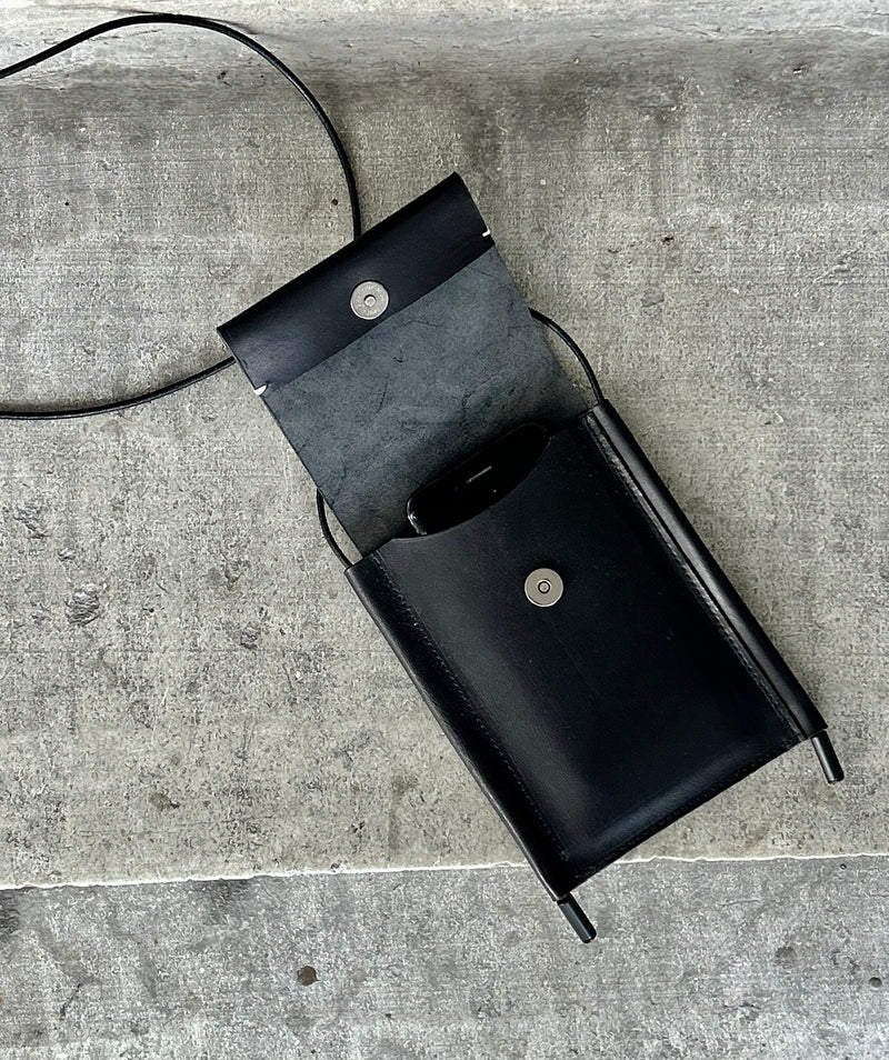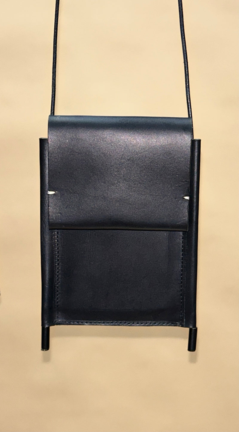 A classic and timeless black unisex phone bag with a crossbody leather strap, crafted from high-quality, sustainable vegetable-tanned leather. This sleek bag goes beyond just holding your phone; it includes a main compartment and a hidden card slot on the back, making it ideal for carrying your essentials with ease.