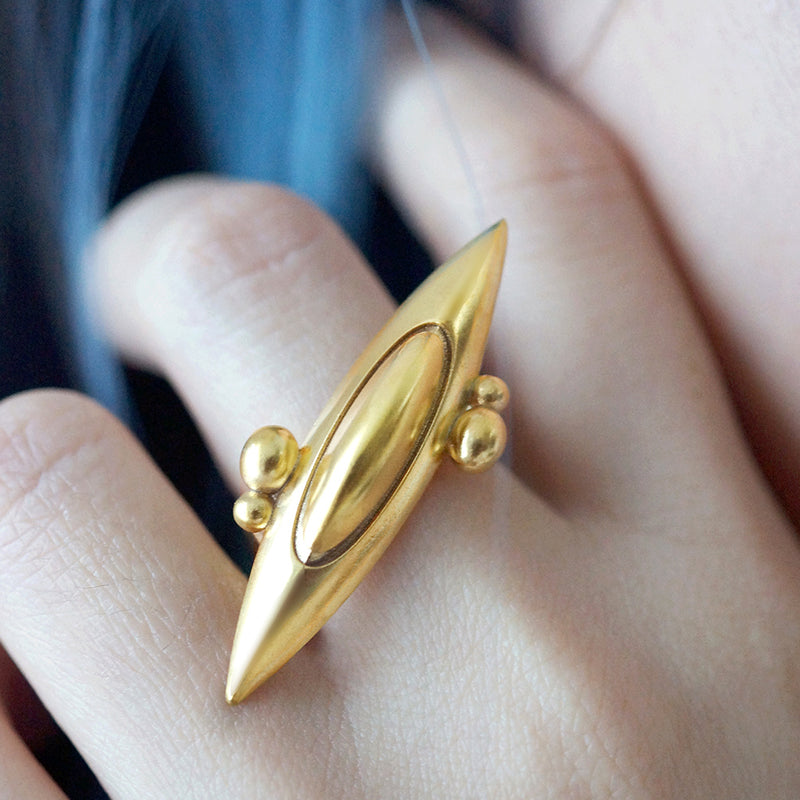 The UNSEEN Ring represents the journey of discovery, transformation, and the unseen forces that shape our paths. The elongated, pointed shape evokes a sense of forward motion and exploration, symbolizing progress and pushing beyond boundaries. Made in New York, crafted from sterling silver and plated with 18k Yellow Gold, this asymmetrical ring features an elongated, pointed shape reminiscent of the front of a spaceship engine or a sail, giving it a sense of forward motion. Its dynamic, minimalist shape makes it perfect for those who appreciate contemporary artistry and cutting-edge style. A versatile accessory that can complement both casual and formal looks, the UNSEEN Ring is a unique statement piece that embodies modern craftsmanship and creative exploration.