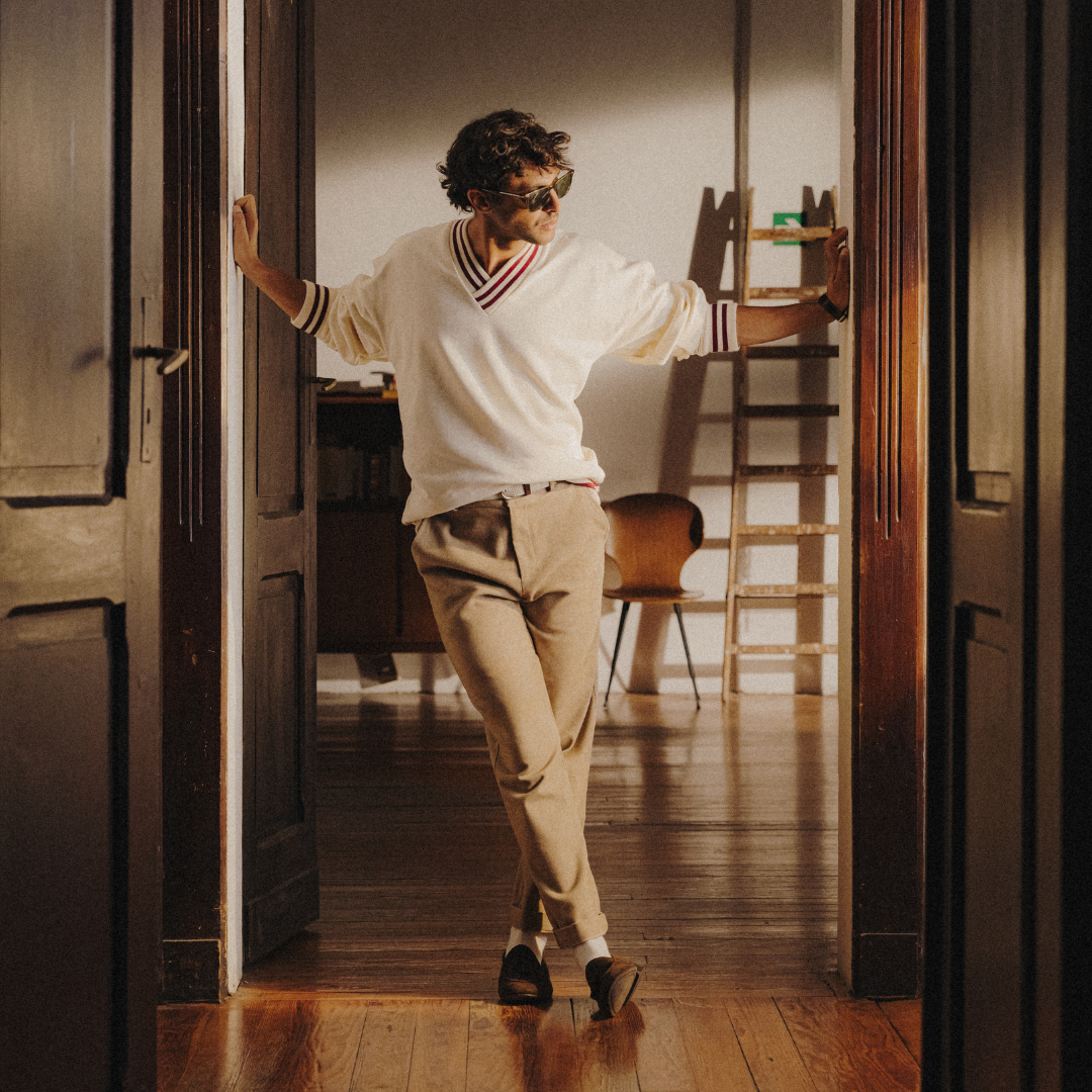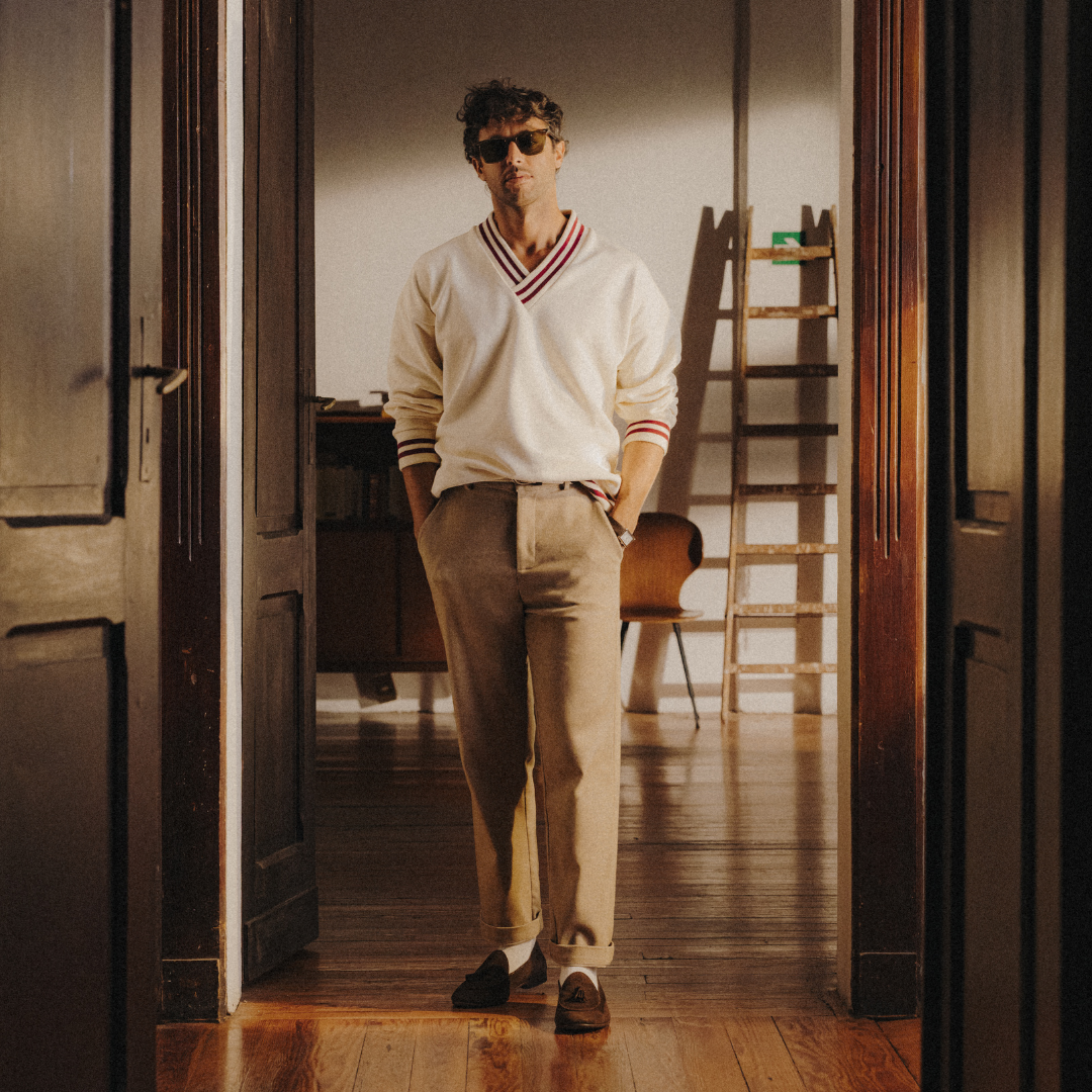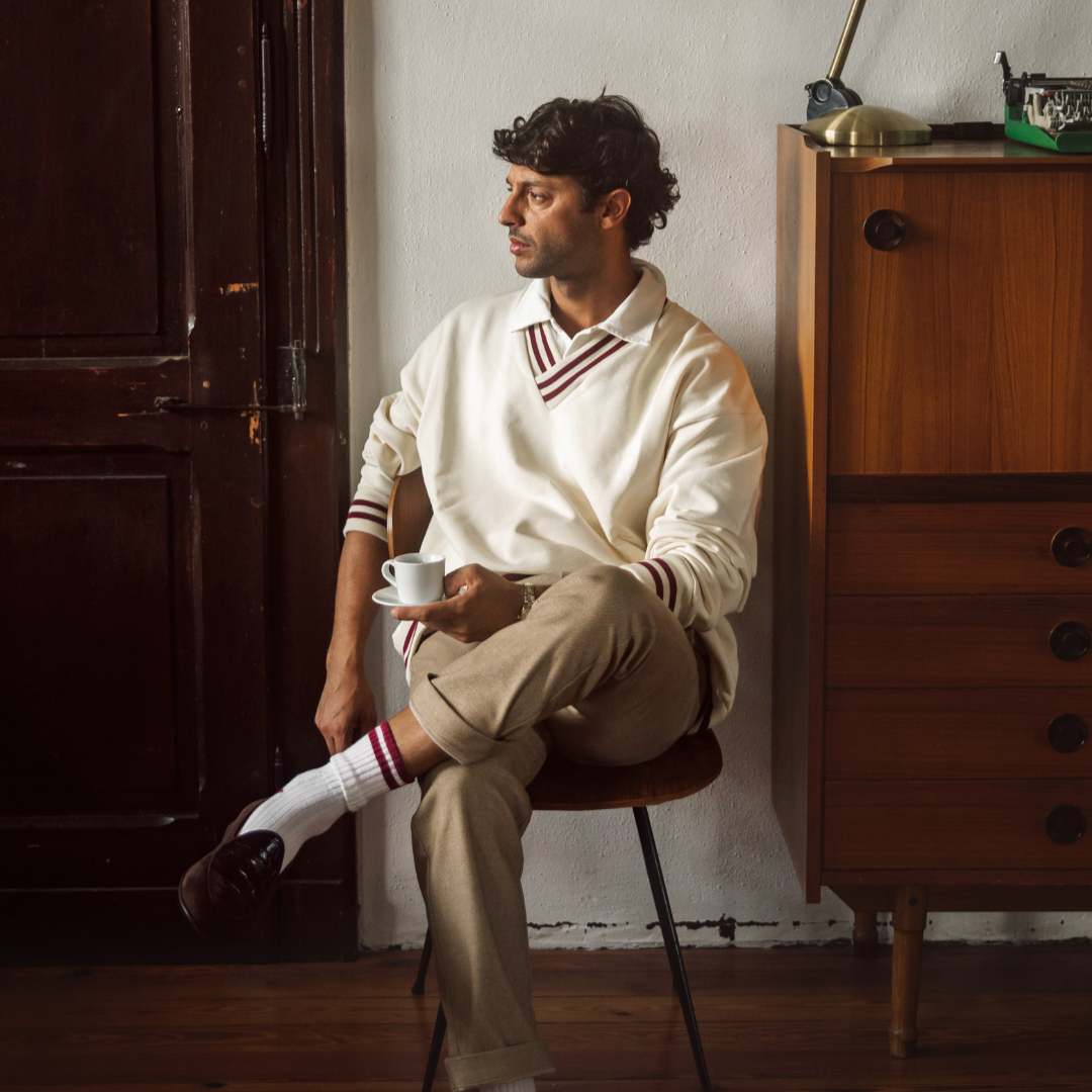 A nod to our best-selling lightweight Club V-Neck Sweater, we gave this piece a heavier update in sweatshirt form. The body is made from 100% jersey cotton, giving it that cozy sweatshirt feel. The neck and cuff trim features the same knit as the original, blending sweater and sweatshirt into one cohesive piece. It’s timeless, versatile, and incredibly comfortable. Wear it by itself or as an extra layer – either way it’s vintage fit and aesthetic will give you that sprezzatura you’ve been looking for.