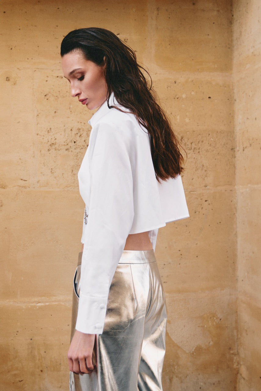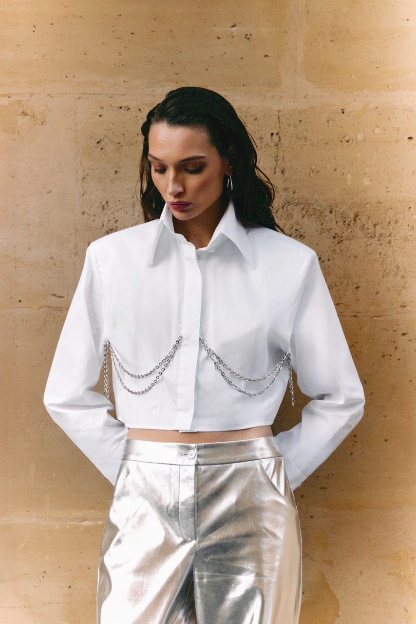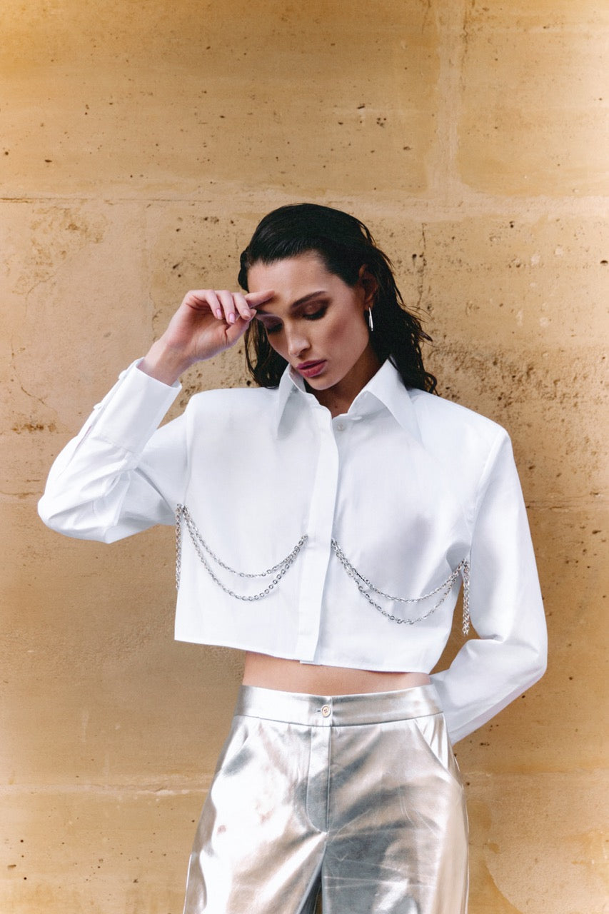 Super white cropped shirt decorated with a silver chain, made of high quality cotton. Relaxed fit, high collar, front button closure and long sleeves with buttoned cuffs, natural mother-of-pearl buttons.