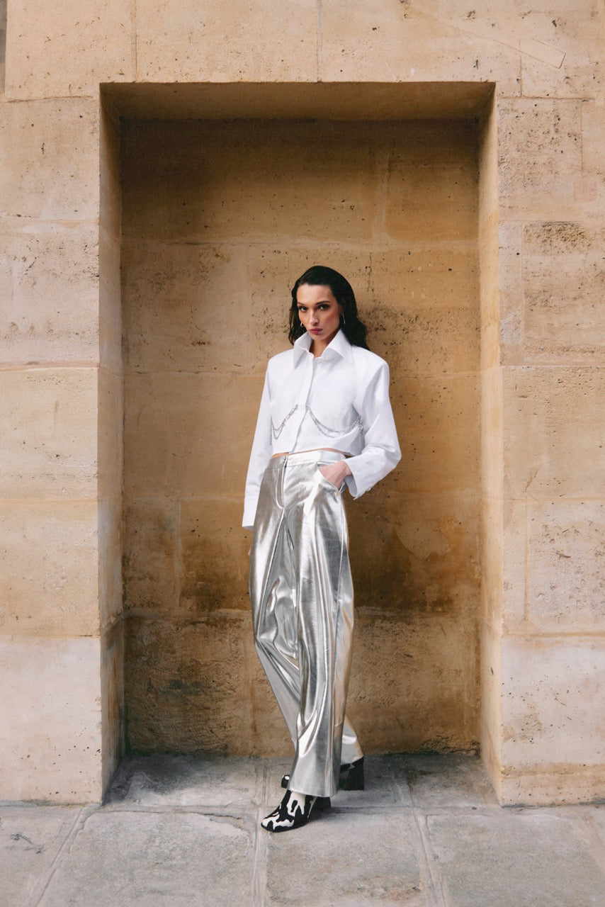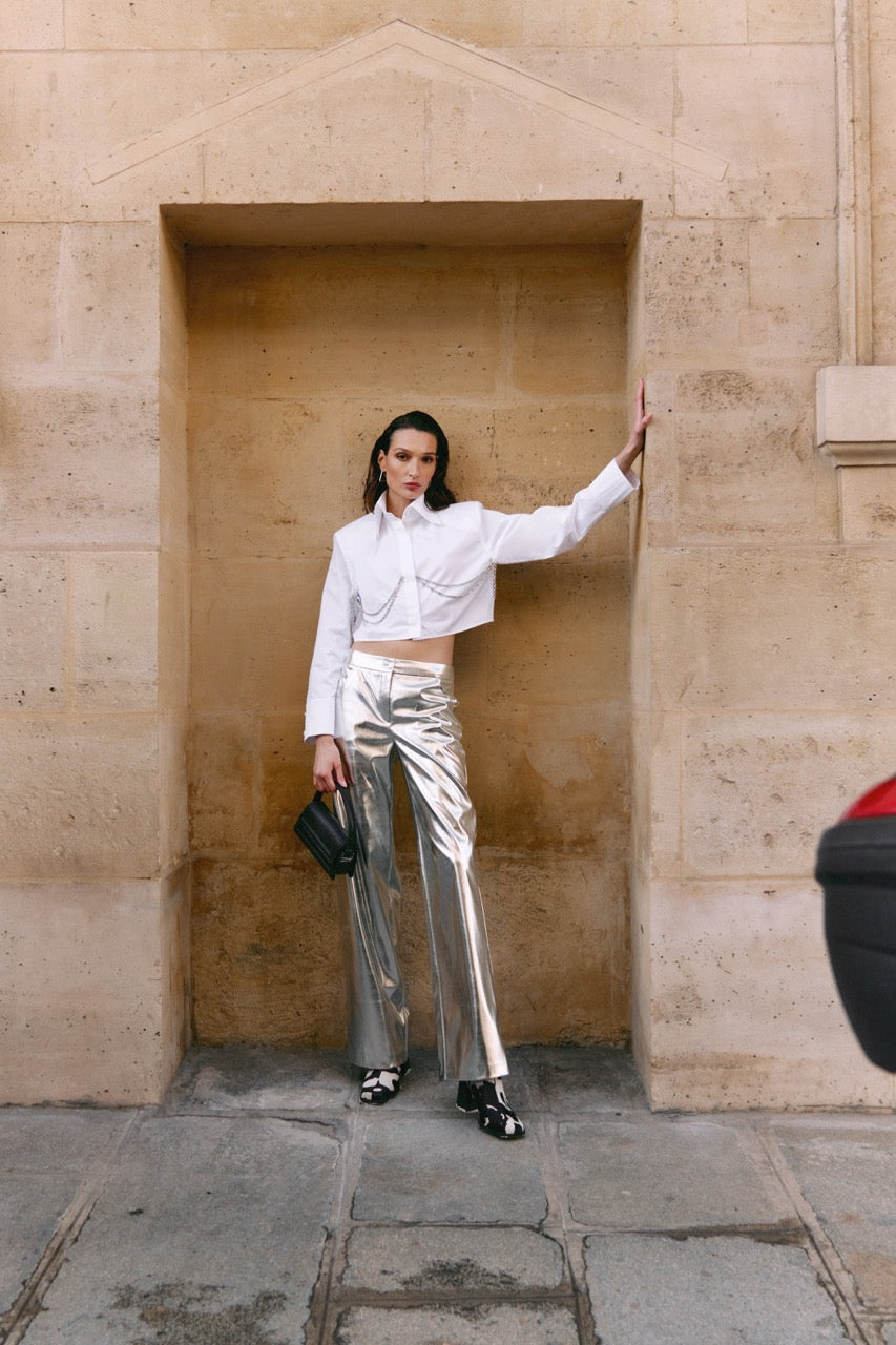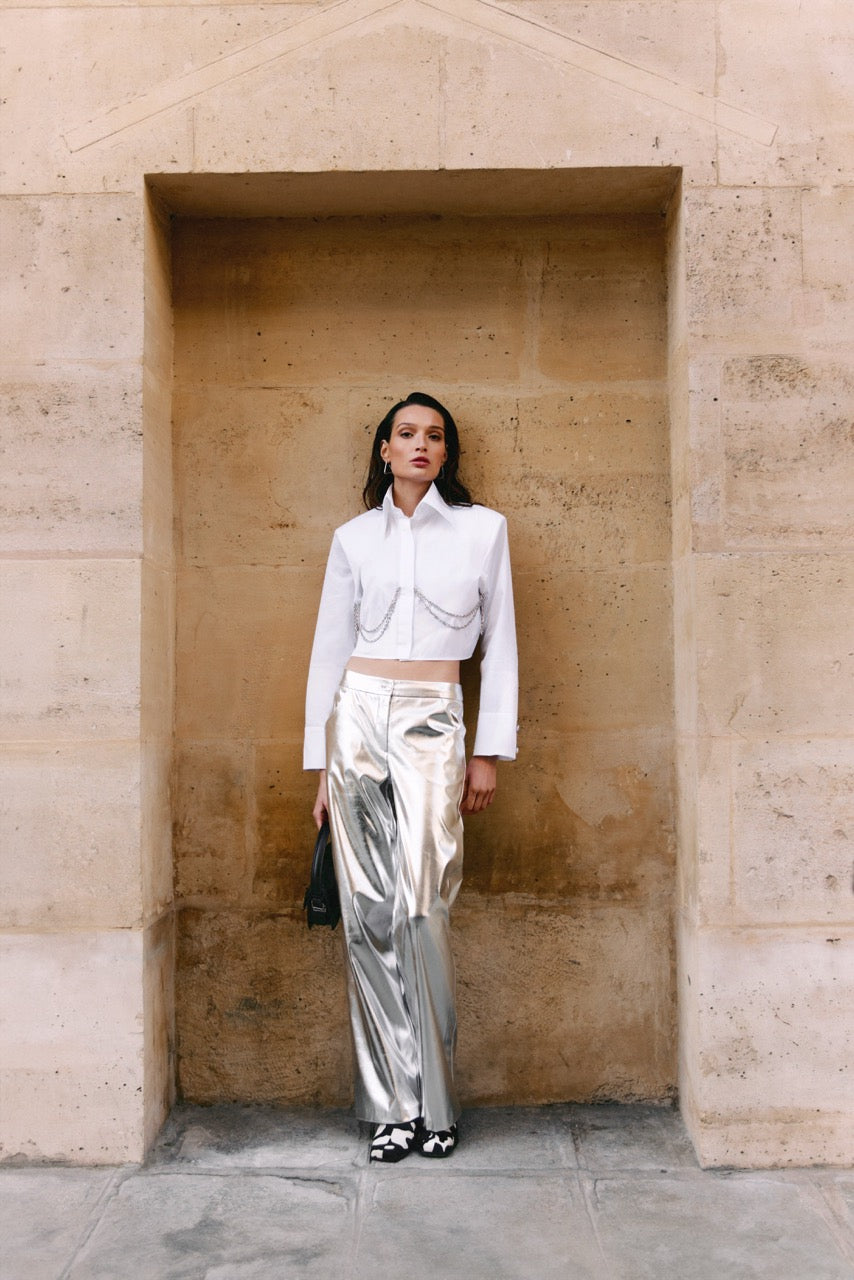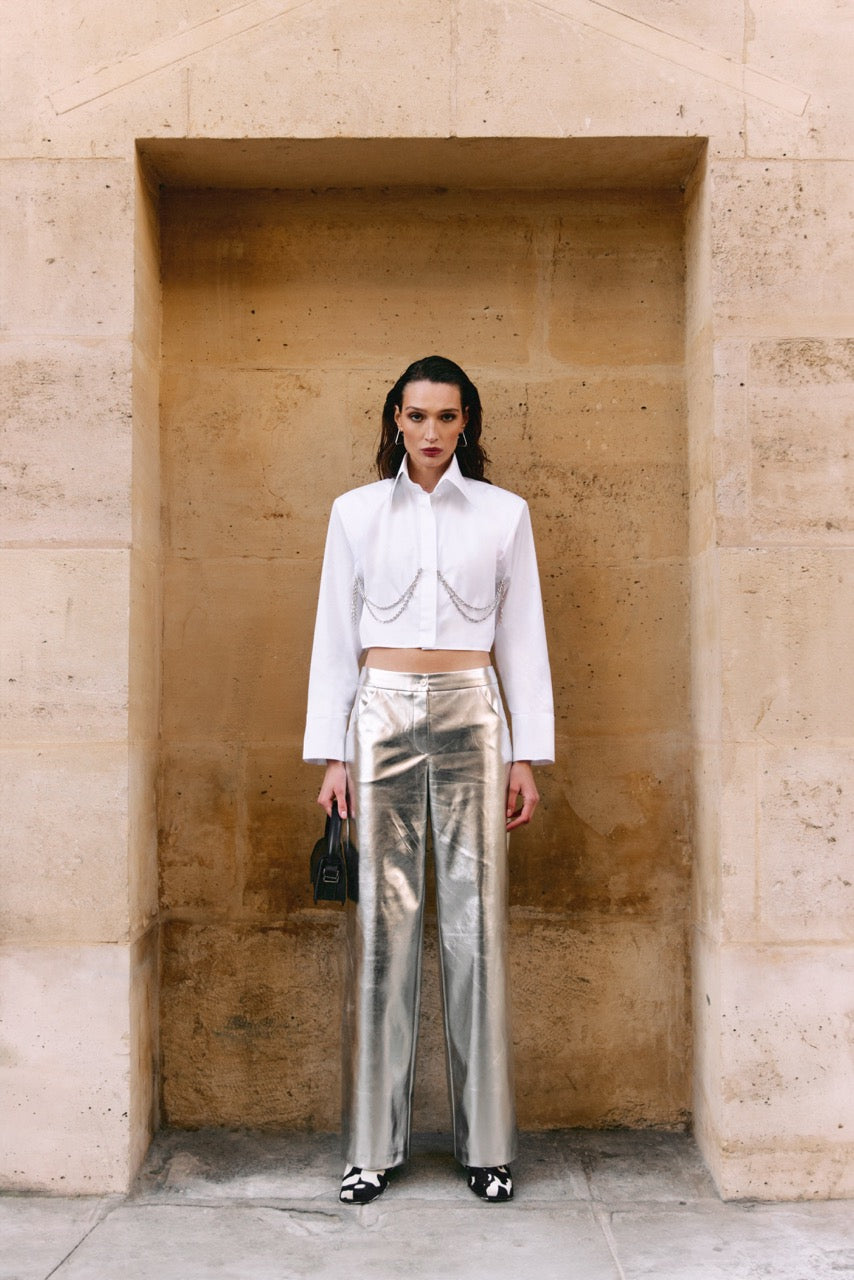 Super white cropped shirt decorated with a silver chain, made of high quality cotton. Relaxed fit, high collar, front button closure and long sleeves with buttoned cuffs, natural mother-of-pearl buttons.