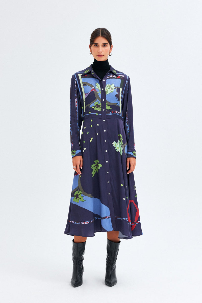 Crafted from 100% pure silk, this long dress is an elegant design inspired by ancient art. Drawing inspiration from the captivating mosaics of the Gaziantep Zeugma Mosaic Museum, this dress beautifully merges art with fashion. Featuring a shirt collar, mother-of-pearl buttons along the front and cuffs, and a flared skirt, it offers a graceful silhouette. Experience the allure of history and the luxurious feel of silk with the Zeugma Silk Long Dress, embodying timeless beauty in every step.